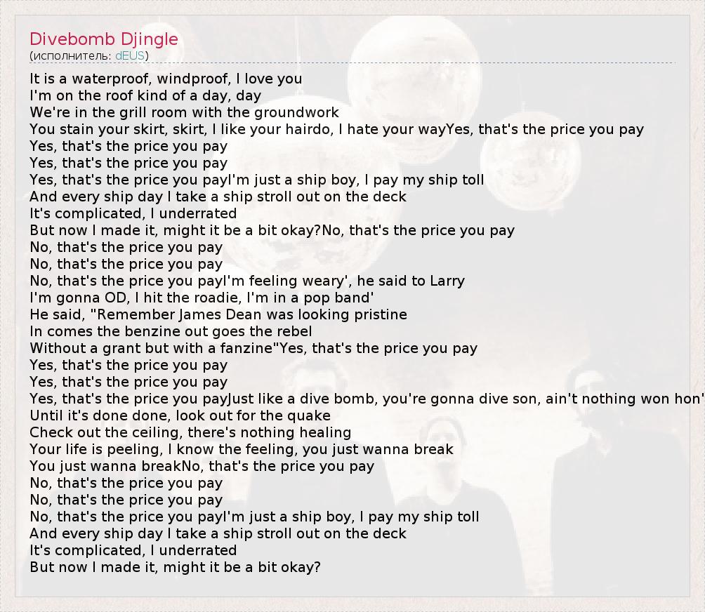 Yes, that's the price you payJust like a dive bomb, you're gonna dive son, ain't nothing won hon'