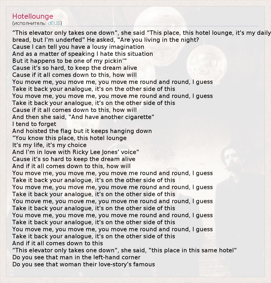 "This elevator only takes one down", she said "This place, this hotel lounge, it's my daily bread, but I'm underfed" He asked, "Are you living in the night? Cause I can tell you have a lousy imagination And as a matter of speaking I hate this situation But it happens to be one of my pickin'" Cause it's so hard, to keep the dream alive Cause if it all comes down to this, how will You move me, you move me, you move me round and round, I guess Take it back your analogue, it's on the other side of this You move me, you move me, you move me round and round, I guess Take it back your analogue, it's on the other side of this Cause if it all comes down to this, how will And then she said, "And have another cigarette" I tend to forget And hoisted the flag but it keeps hanging down "You know this place, this hotel lounge It's my life, it's my choice And I'm in love with Ricky Lee Jones' voice" Cause it's so hard to keep the dream alive And if it all comes down to this, how will You move me, you move me, you move me round and round, I guess Take it back your analogue, it's on the other side of this You move me, you move me, you move me round and round, I guess Take it back your analogue, it's on the other side of this You move me, you move me, you move me round and round, I guess Take it back your analogue, it's on the other side of this You move me, you move me, you move me round and round, I guess Take it back your analogue, it's on the other side of this You move me, you move me, you move me round and round, I guess Take it back your analogue, it's on the other side of this And if it all comes down to this "This elevator only takes one down", she said, "this place in this same hotel" Do you see that man in the left-hand corner Do you see that woman their love-story's famous