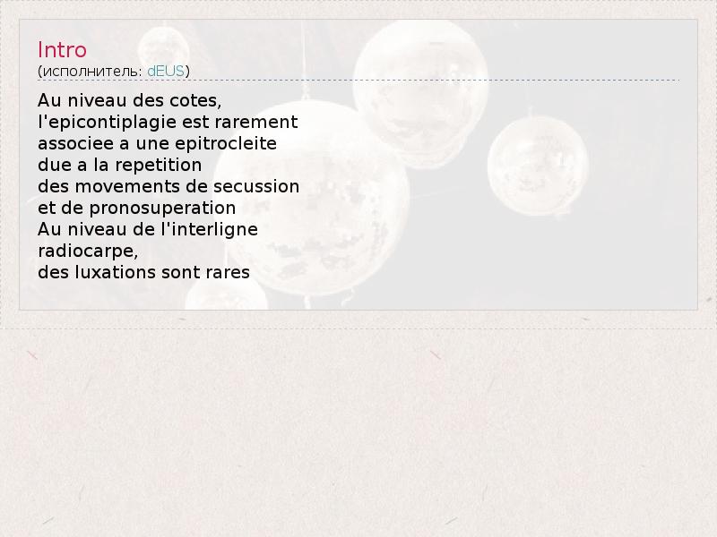 Au niveau des cotes, l'epicontiplagie est rarement associee a une epitrocleite due a la repetition des movements de secussion et de pronosuperation Au niveau de l'interligne radiocarpe, des luxations sont rares
