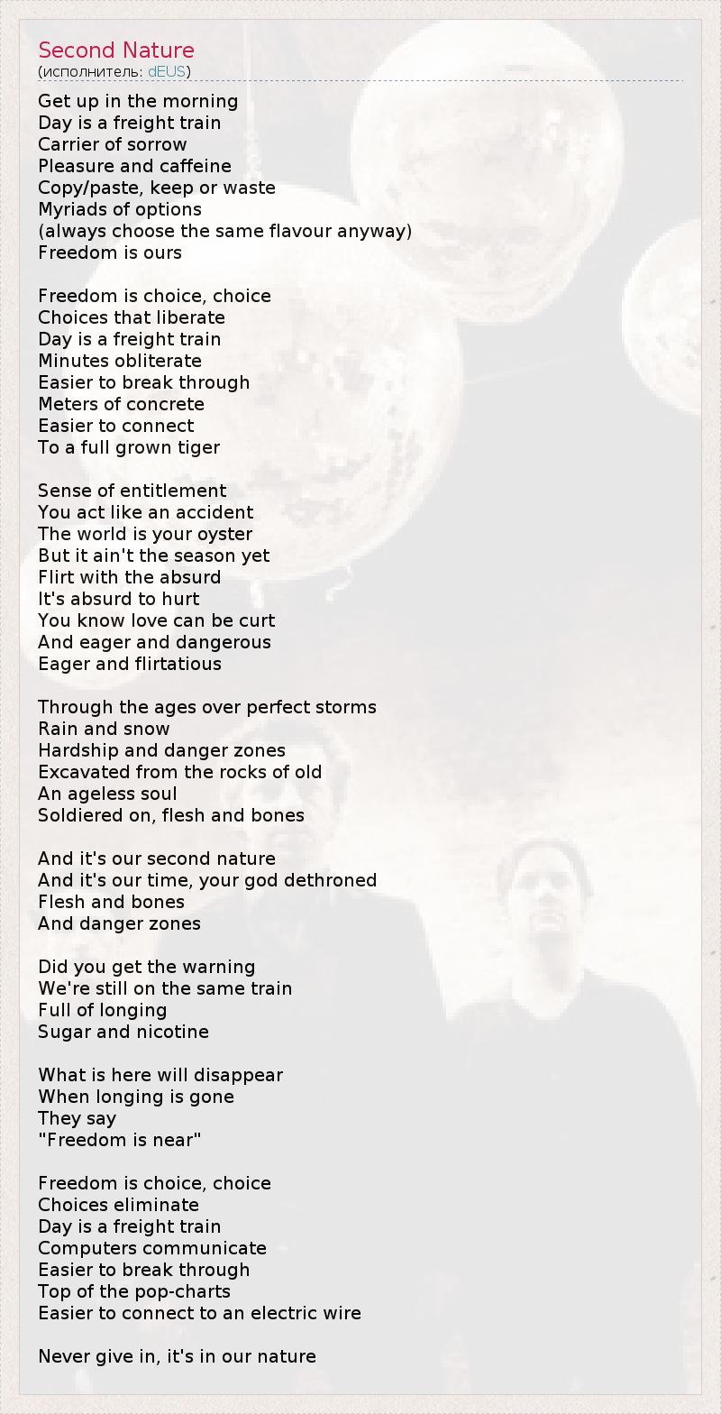 Get up in the morning Day is a freight train Carrier of sorrow Pleasure and caffeine Copy/paste, keep or waste Myriads of options (always choose the same flavour anyway) Freedom is ours Freedom is choice, choice Choices that liberate Day is a freight train Minutes obliterate Easier to break through Meters of concrete Easier to connect To a full grown tiger Sense of entitlement You act like an accident The world is your oyster But it ain't the season yet Flirt with the absurd It's absurd to hurt You know love can be curt And eager and dangerous Eager and flirtatious Through the ages over perfect storms Rain and snow Hardship and danger zones Excavated from the rocks of old An ageless soul Soldiered on, flesh and bones And it's our second nature And it's our time, your god dethroned Flesh and bones And danger zones Did you get the warning We're still on the same train Full of longing Sugar and nicotine What is here will disappear When longing is gone They say "Freedom is near" Freedom is choice, choice Choices eliminate Day is a freight train Computers communicate Easier to break through Top of the pop-charts Easier to connect to an electric wire Never give in, it's in our nature