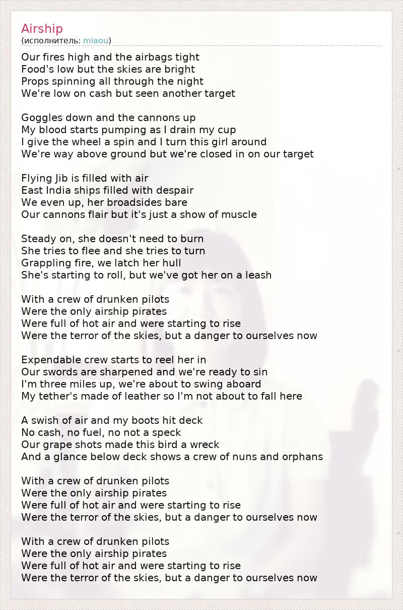Наши огни направлены вверх, воздушные камеры крепки, Продовольствие на исходе, но зато небеса ясны. Пропеллеры вращаются всю ночь напролёт, С деньгами туговато, но мы приметили очередную цель. Орудия наготове, гоглы на носу – Моя кровь вскипает, словно я осушил стаканчик-другой, Я кручу штурвал и разворачиваю эту девочку**, Мы парим над землёй, мы близки к нашей цели. Кливер воздухом заполнен, Суда Ист-Индской кампании в полном отчаянии, Мы поравнялись с их гладкими бортами, Даём один залп, но это всего лишь демонстрация силы... Осторожно, она не должна сгореть, Она пытается сбежать, пытается развернуться, Объята пламенем – мы прикрываем её корпус, Она начинает заваливаться, но она уже у нас на поводке. С экипажем пьяных пилотов Мы единственные воздушные пираты, Мы полны горячего воздуха, мы взлетаем, Мы – ужас небес, но сейчас и сами в опасности. Потрёпанный экипаж пытается завести её, Но мы заточили ножи и готовы пролить кровь. Я взмываю на три мили, мы берём их на абордаж, Моя кожаная привязь не даёт мне упасть. Со свистом рассекая воздух, мои ноги оказываются на их палубе, Но ни денег, ни топлива – вообще ничего. Наша картечь подбила эту пташку, А на борту кроме экипажа лишь монашки да сироты... С экипажем пьяных пилотов Мы единственные воздушные пираты, Мы полны горячего воздуха, мы взлетаем, Мы – ужас небес, но сейчас и сами в опасности. С экипажем пьяных пилотов Мы единственные воздушные пираты, Мы полны горячего воздуха, мы взлетаем, Мы – ужас небес, но сейчас и сами в опасности. *дословно можно перевести как "Пираты дирижабля". **имеется в виду дирижабль "Офелия", с чьим экипажем отожествляют себя участники группы.