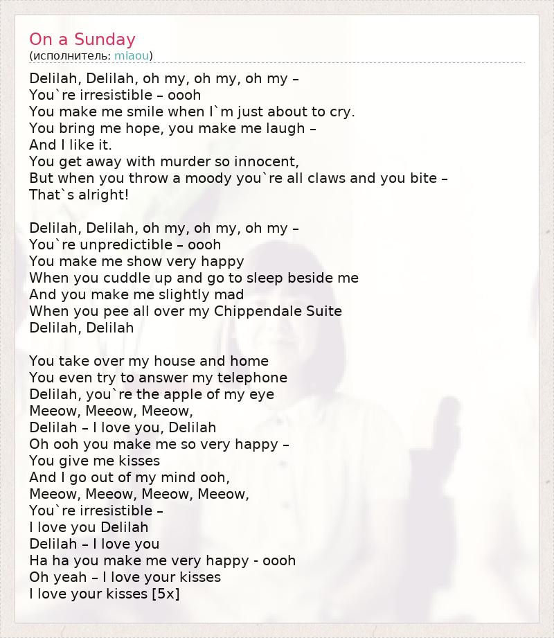 Delilah, Delilah, oh my, oh my, oh my – You`re irresistible – oooh You make me smile when I`m just about to cry. You bring me hope, you make me laugh – And I like it. You get away with murder so innocent, But when you throw a moody you`re all claws and you bite – That`s alright! Delilah, Delilah, oh my, oh my, oh my – You`re unpredictible – oooh You make me show very happy When you cuddle up and go to sleep beside me And you make me slightly mad When you pee all over my Chippendale Suite Delilah, Delilah You take over my house and home You even try to answer my telephone Delilah, you`re the apple of my eye Meeow, Meeow, Meeow, Delilah – I love you, Delilah Oh ooh you make me so very happy – You give me kisses And I go out of my mind ooh, Meeow, Meeow, Meeow, Meeow, You`re irresistible – I love you Delilah Delilah – I love you Ha ha you make me very happy - oooh Oh yeah – I love your kisses I love your kisses [5x]