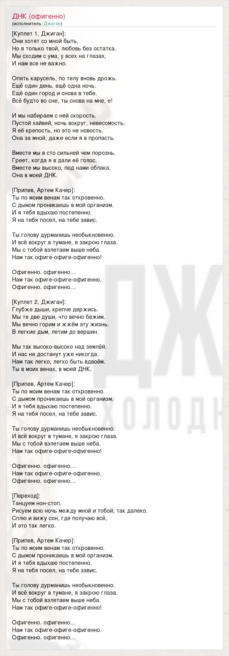 [Куплет 1, Джиган]: Они хотят со мной быть, Но я только твой, любовь без остатка. Мы сходим с ума, у всех на глазах, И нам все не важно. Опять карусель, по телу вновь дрожь. Ещё один день, ещё одна ночь. Ещё один город и снова в тебе. Всё будто во сне, ты снова на мне, е! И мы набираем с ней скорость. Пустой хайвей, ночь вокруг, невесомость. Я её крепость, но это не новость. Она за мной, даже если я в пропасть. Вместе мы в сто сильней чем порознь. Греет, когда я в дали её голос. Вместе мы высоко, под нами облака. Она в моей ДНК. [Припев, Артем Качер]: Ты по моим венам так откровенно. С дымом проникаешь в мой организм. И я тебя вдыхаю постепенно. Я на тебя посел, на тебе завис. Ты голову дурманишь необыкновенно. И всё вокруг в тумане, я закрою глаза. Мы с тобой взлетаем выше неба. Нам так офиге-офиге-офигенно! Офигенно. офигенно… Нам так офиге-офиге-офигенно. Офигенно. офигенно… [Куплет 2, Джиган]: Глубже дыши, крепче держись. Мы те две души, что вечно бежим. Мы вечно горим и жжём эту жизнь. В легкие дым, летим до вершин. Мы так высоко-высоко над землёй. И нас не достанут уже никогда. Нам так легко, легко быть вдвоём. Ты в моих венах, в моей ДНК. [Припев, Артем Качер]: Ты по моим венам так откровенно. С дымом проникаешь в мой организм. И я тебя вдыхаю постепенно. Я на тебя посел, на тебе завис. Ты голову дурманишь необыкновенно. И всё вокруг в тумане, я закрою глаза. Мы с тобой взлетаем выше неба. Нам так офиге-офиге-офигенно! Офигенно. офигенно… Нам так офиге-офиге-офигенно. Офигенно. офигенно… [Переход]: Танцуем нон-стоп. Рисуем всю ночь между мной и тобой, так далеко. Сплю и вижу сон, где получаю всё, И это так легко. [Припев, Артем Качер]: Ты по моим венам так откровенно. С дымом проникаешь в мой организм. И я тебя вдыхаю постепенно. Я на тебя посел, на тебе завис. Ты голову дурманишь необыкновенно. И всё вокруг в тумане, я закрою глаза. Мы с тобой взлетаем выше неба. Нам так офиге-офиге-офигенно! Офигенно. офигенно… Нам так офиге-офиге-офигенно. Офигенно. офигенно…