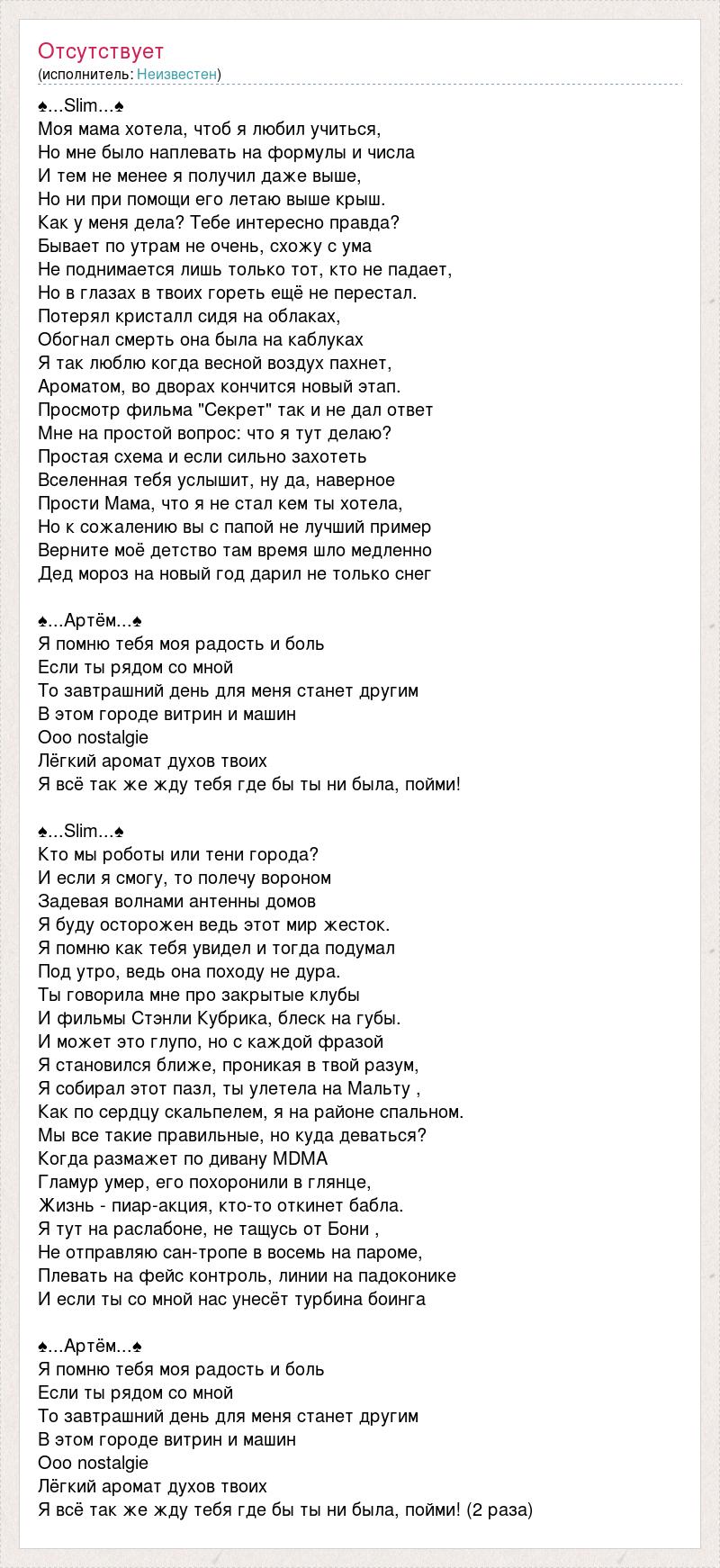 ♠...Slim...♠ Моя мама хотела, чтоб я любил учиться, Но мне было наплевать на формулы и числа И тем не менее я получил даже выше, Но ни при помощи его летаю выше крыш. Как у меня дела? Тебе интересно правда? Бывает по утрам не очень, схожу с ума Не поднимается лишь только тот, кто не падает, Но в глазах в твоих гореть ещё не перестал. Потерял кристалл сидя на облаках, Обогнал смерть она была на каблуках Я так люблю когда весной воздух пахнет, Ароматом, во дворах кончится новый этап. Просмотр фильма "Секрет" так и не дал ответ Мне на простой вопрос: что я тут делаю? Простая схема и если сильно захотеть Вселенная тебя услышит, ну да, наверное Прости Мама, что я не стал кем ты хотела, Но к сожалению вы с папой не лучший пример Верните моё детство там время шло медленно Дед мороз на новый год дарил не только снег ♠...Артём...♠ Я помню тебя моя радость и боль Если ты рядом со мной То завтрашний день для меня станет другим В этом городе витрин и машин Ооо nostalgie Лёгкий аромат духов твоих Я всё так же жду тебя где бы ты ни была, пойми! ♠...Slim...♠ Кто мы роботы или тени города? И если я смогу, то полечу вороном Задевая волнами антенны домов Я буду осторожен ведь этот мир жесток. Я помню как тебя увидел и тогда подумал Под утро, ведь она походу не дура. Ты говорила мне про закрытые клубы И фильмы Стэнли Кубрика, блеск на губы. И может это глупо, но с каждой фразой Я становился ближе, проникая в твой разум, Я собирал этот пазл, ты улетела на Мальту , Как по сердцу скальпелем, я на районе спальном. Мы все такие правильные, но куда деваться? Когда размажет по дивану MDMA Гламур умер, его похоронили в глянце, Жизнь - пиар-акция, кто-то откинет бабла. Я тут на раслабоне, не тащусь от Бони , Не отправляю сан-тропе в восемь на пароме, Плевать на фейс контроль, линии на падоконике И если ты со мной нас унесёт турбина боинга ♠...Артём...♠ Я помню тебя моя радость и боль Если ты рядом со мной То завтрашний день для меня станет другим В этом городе витрин и машин Ооо nostalgie Лёгкий аромат духов твоих Я всё так же жду тебя где бы ты ни была, пойми! (2 раза)