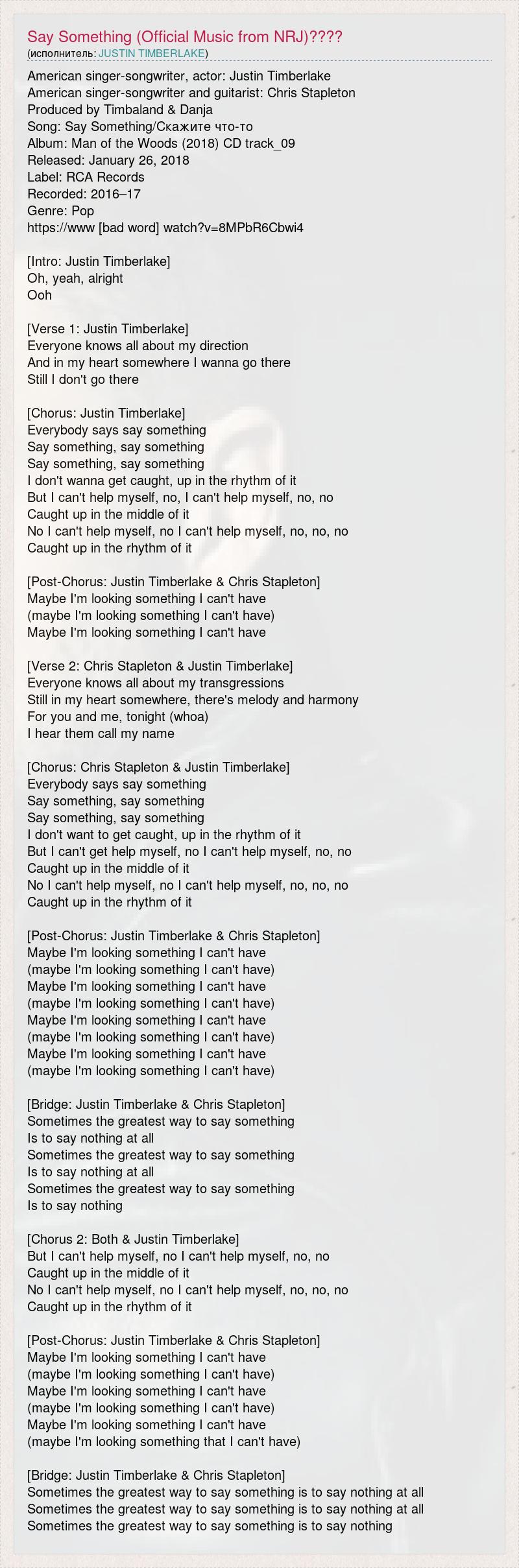 American singer-songwriter, actor: Justin Timberlake American singer-songwriter and guitarist: Chris Stapleton Produced by Timbaland & Danja Song: Say Something/Скажите что-то Album: Man of the Woods (2018) CD track_09 Released: January 26, 2018 Label: RCA Records Recorded: 2016–17 Genre: Pop https://www [bad word] watch?v=8MPbR6Cbwi4 [Intro: Justin Timberlake] Oh, yeah, alright Ooh [Verse 1: Justin Timberlake] Everyone knows all about my direction And in my heart somewhere I wanna go there Still I don't go there [Chorus: Justin Timberlake] Everybody says say something Say something, say something Say something, say something I don't wanna get caught, up in the rhythm of it But I can't help myself, no, I can't help myself, no, no Caught up in the middle of it No I can't help myself, no I can't help myself, no, no, no Caught up in the rhythm of it [Post-Chorus: Justin Timberlake & Chris Stapleton] Maybe I'm looking something I can't have (maybe I'm looking something I can't have) Maybe I'm looking something I can't have [Verse 2: Chris Stapleton & Justin Timberlake] Everyone knows all about my transgressions Still in my heart somewhere, there's melody and harmony For you and me, tonight (whoa) I hear them call my name [Chorus: Chris Stapleton & Justin Timberlake] Everybody says say something Say something, say something Say something, say something I don't want to get caught, up in the rhythm of it But I can't get help myself, no I can't help myself, no, no Caught up in the middle of it No I can't help myself, no I can't help myself, no, no, no Caught up in the rhythm of it [Post-Chorus: Justin Timberlake & Chris Stapleton] Maybe I'm looking something I can't have (maybe I'm looking something I can't have) Maybe I'm looking something I can't have (maybe I'm looking something I can't have) Maybe I'm looking something I can't have (maybe I'm looking something I can't have) Maybe I'm looking something I can't have (maybe I'm looking something I can't have) [Bridge: Justin Timberlake & Chris Stapleton] Sometimes the greatest way to say something Is to say nothing at all Sometimes the greatest way to say something Is to say nothing at all Sometimes the greatest way to say something Is to say nothing [Chorus 2: Both & Justin Timberlake] But I can't help myself, no I can't help myself, no, no Caught up in the middle of it No I can't help myself, no I can't help myself, no, no, no Caught up in the rhythm of it [Post-Chorus: Justin Timberlake & Chris Stapleton] Maybe I'm looking something I can't have (maybe I'm looking something I can't have) Maybe I'm looking something I can't have (maybe I'm looking something I can't have) Maybe I'm looking something I can't have (maybe I'm looking something that I can't have) [Bridge: Justin Timberlake & Chris Stapleton] Sometimes the greatest way to say something is to say nothing at all Sometimes the greatest way to say something is to say nothing at all Sometimes the greatest way to say something is to say nothing