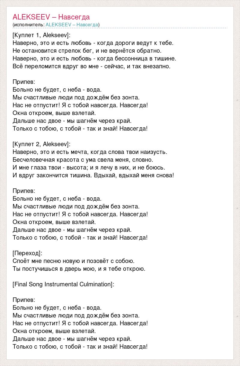 [Куплет 1, Alekseev]: Наверно, это и есть любовь - когда дороги ведут к тебе. Не остановится стрелок бег, и не вернётся обратно. Наверно, это и есть любовь - когда бессонница в тишине. Всё переломится вдруг во мне - сейчас, и так внезапно. Припев: Больно не будет, с неба - вода. Мы счастливые люди под дождём без зонта. Нас не отпустит! Я с тобой навсегда. Навсегда! Окна откроем, выше взлетай. Дальше нас двое - мы шагнём через край. Только с тобою, с тобой - так и знай! Навсегда! [Куплет 2, Alekseev]: Наверно, это и есть мечта, когда слова твои наизусть. Бесчеловечная красота с ума свела меня, словно. И мне глаза твои - высота; и я лечу в них, и не боюсь. И вдруг закончится тишина. Вдыхай, вдыхай меня снова! Припев: Больно не будет, с неба - вода. Мы счастливые люди под дождём без зонта. Нас не отпустит! Я с тобой навсегда. Навсегда! Окна откроем, выше взлетай. Дальше нас двое - мы шагнём через край. Только с тобою, с тобой - так и знай! Навсегда! [Переход]: Споёт мне песню новую и позовёт с собою. Ты постучишься в дверь мою, и я тебе открою. [Final Song Instrumental Culmination]: Припев: Больно не будет, с неба - вода. Мы счастливые люди под дождём без зонта. Нас не отпустит! Я с тобой навсегда. Навсегда! Окна откроем, выше взлетай. Дальше нас двое - мы шагнём через край. Только с тобою, с тобой - так и знай! Навсегда!