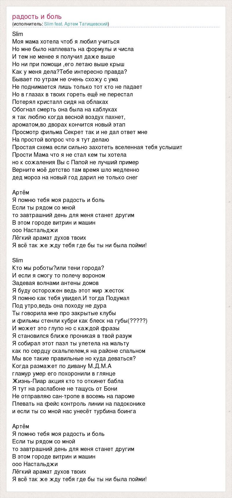 Slim Моя мама хотела чтоб я любил учиться Но мне было наплевать на формулы и числа И тем не менее я получил даже выше Но ни при помощи ,его летаю выше крыш Как у меня дела?Тебе интересно правда? Бывает по утрам не очень схожу с ума Не поднимается лишь только тот кто не падает Но в глазах в твоих гореть ещё не перестал Потерял кристалл сидя на облаках Обогнал смерть она была на каблуках я так люблю когда весной воздух пахнет, ароматом,во дворах кончится новый этап Просмотр фильма Секрет так и не дал ответ мне На простой вопрос что я тут делаю Простая схема если сильно захотеть вселенная тебя услышит Прости Мама что я не стал кем ты хотела но к сожаления Вы с Папой не лучший пример Верните моё детство там время шло медленно дед мороз на новый год дарил не только снег Артём Я помню тебя моя радость и боль Если ты рядом со мной то завтрашний день для меня станет другим В этом городе витрин и машин ооо Настальджи Лёгкий арамат духов твоих Я всё так же жду тебя где бы ты ни была пойми! Slim Кто мы роботы?или тени города? И если я смогу то полечу вороном Задевая волнами антены домов Я буду осторожен ведь этот мир жесток Я помню как тебя увидел.И тогда Подумал Под утро,ведь она походу не дура Ты говорила мне про закрытые клубы и фильмы стенли кубри как блеск на губы(?????) И может это глупо но с каждой фразы Я становился ближе проникая в твой разум Я собирал этот пазл ты улетела на мальту как по сердцу скальпелем,я на районе спальном Мы все такие правильные но куда деваться? Когда размажет по дивану М.Д.М.А гламур умер его похоронили в глянце Жизнь-Пиар акция кто то откинет бабла Я тут на раслабоне не тащусь от Бони Не отправляю сан-тропе в восемь на пароме Плевать на фейс контроль линии на падоконике и если ты со мной нас унесёт турбина боинга Артём Я помню тебя моя радость и боль Если ты рядом со мной то завтрашний день для меня станет другим В этом городе витрин и машин ооо Настальджи Лёгкий арамат духов твоих Я всё так же жду тебя где бы ты ни была пойми!