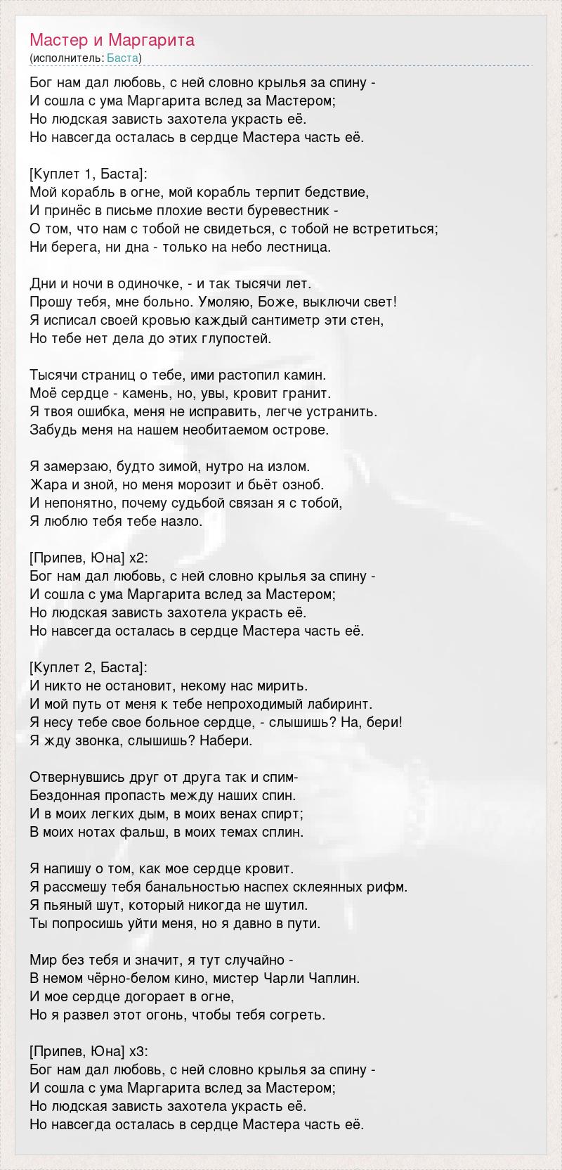 Бог нам дал любовь, с ней словно крылья за спину - И сошла с ума Маргарита вслед за Мастером; Но людская зависть захотела украсть её. Но навсегда осталась в сердце Мастера часть её. [Куплет 1, Баста]: Мой корабль в огне, мой корабль терпит бедствие, И принёс в письме плохие вести буревестник - О том, что нам с тобой не свидеться, с тобой не встретиться; Ни берега, ни дна - только на небо лестница. Дни и ночи в одиночке, - и так тысячи лет. Прошу тебя, мне больно. Умоляю, Боже, выключи свет! Я исписал своей кровью каждый сантиметр эти стен, Но тебе нет дела до этих глупостей. Тысячи страниц о тебе, ими растопил камин. Моё сердце - камень, но, увы, кровит гранит. Я твоя ошибка, меня не исправить, легче устранить. Забудь меня на нашем необитаемом острове. Я замерзаю, будто зимой, нутро на излом. Жара и зной, но меня морозит и бьёт озноб. И непонятно, почему судьбой связан я с тобой, Я люблю тебя тебе назло. [Припев, Юна] x2: Бог нам дал любовь, с ней словно крылья за спину - И сошла с ума Маргарита вслед за Мастером; Но людская зависть захотела украсть её. Но навсегда осталась в сердце Мастера часть её. [Куплет 2, Баста]: И никто не остановит, некому нас мирить. И мой путь от меня к тебе непроходимый лабиринт. Я несу тебе свое больное сердце, - слышишь? На, бери! Я жду звонка, слышишь? Набери. Отвернувшись друг от друга так и спим- Бездонная пропасть между наших спин. И в моих легких дым, в моих венах спирт; В моих нотах фальш, в моих темах сплин. Я напишу о том, как мое сердце кровит. Я рассмешу тебя банальностью наспех склеянных рифм. Я пьяный шут, который никогда не шутил. Ты попросишь уйти меня, но я давно в пути. Мир без тебя и значит, я тут случайно - В немом чёрно-белом кино, мистер Чарли Чаплин. И мое сердце догорает в огне, Но я развел этот огонь, чтобы тебя согреть. [Припев, Юна] x3: Бог нам дал любовь, с ней словно крылья за спину - И сошла с ума Маргарита вслед за Мастером; Но людская зависть захотела украсть её. Но навсегда осталась в сердце Мастера часть её.