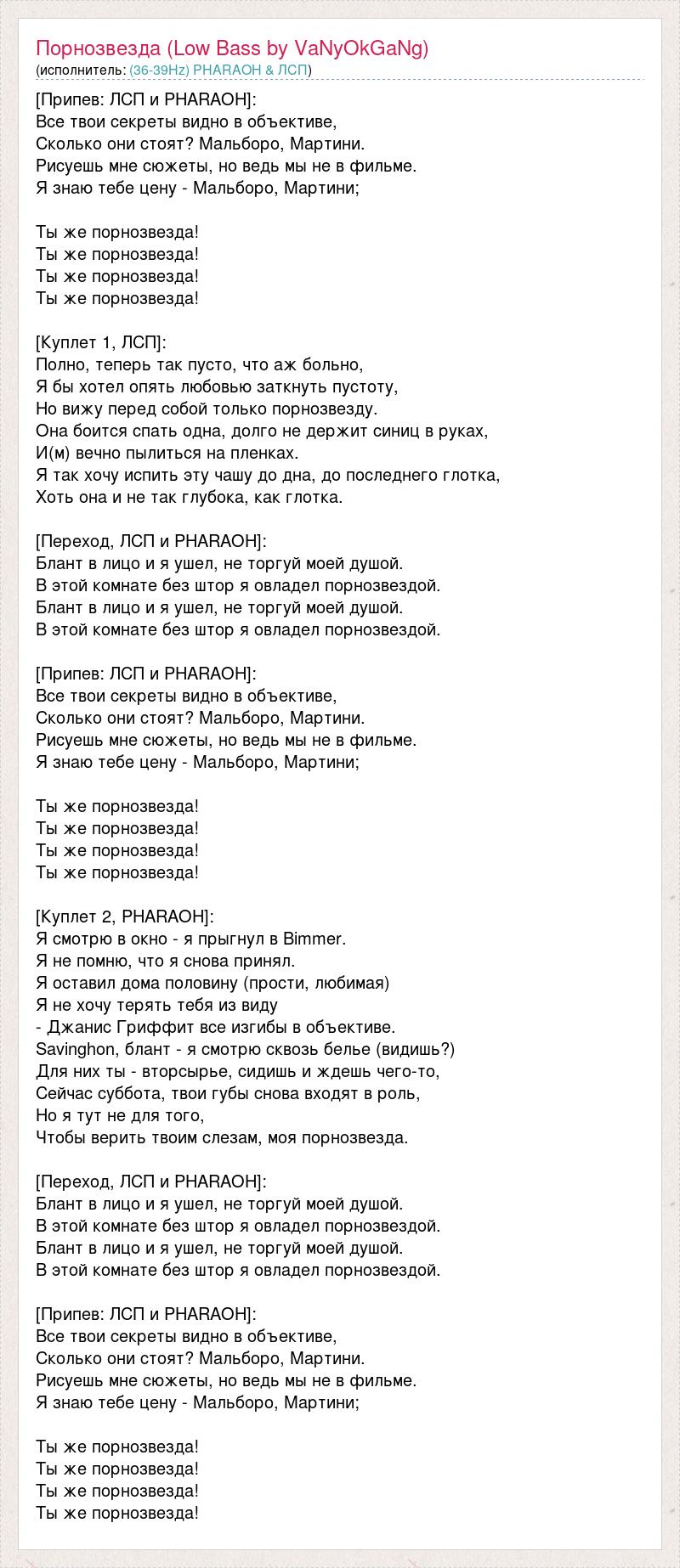 [Припев: ЛСП и PHARAOH]: Все твои секреты видно в объективе, Сколько они стоят? Мальборо, Мартини. Рисуешь мне сюжеты, но ведь мы не в фильме. Я знаю тебе цену - Мальборо, Мартини; Ты же порнозвезда! Ты же порнозвезда! Ты же порнозвезда! Ты же порнозвезда! [Куплет 1, ЛСП]: Полно, теперь так пусто, что аж больно, Я бы хотел опять любовью заткнуть пустоту, Но вижу перед собой только порнозвезду. Она боится спать одна, долго не держит синиц в руках, И(м) вечно пылиться на пленках. Я так хочу испить эту чашу до дна, до последнего глотка, Хоть она и не так глубока, как глотка. [Переход, ЛСП и PHARAOH]: Блант в лицо и я ушел, не торгуй моей душой. В этой комнате без штор я овладел порнозвездой. Блант в лицо и я ушел, не торгуй моей душой. В этой комнате без штор я овладел порнозвездой. [Припев: ЛСП и PHARAOH]: Все твои секреты видно в объективе, Сколько они стоят? Мальборо, Мартини. Рисуешь мне сюжеты, но ведь мы не в фильме. Я знаю тебе цену - Мальборо, Мартини; Ты же порнозвезда! Ты же порнозвезда! Ты же порнозвезда! Ты же порнозвезда! [Куплет 2, PHARAOH]: Я смотрю в окно - я прыгнул в Bimmer. Я не помню, что я снова принял. Я оставил дома половину (прости, любимая) Я не хочу терять тебя из виду - Джанис Гриффит все изгибы в объективе. Savinghon, блант - я смотрю сквозь белье (видишь?) Для них ты - вторсырье, сидишь и ждешь чего-то, Сейчас суббота, твои губы снова входят в роль, Но я тут не для того, Чтобы верить твоим слезам, моя порнозвезда. [Переход, ЛСП и PHARAOH]: Блант в лицо и я ушел, не торгуй моей душой. В этой комнате без штор я овладел порнозвездой. Блант в лицо и я ушел, не торгуй моей душой. В этой комнате без штор я овладел порнозвездой. [Припев: ЛСП и PHARAOH]: Все твои секреты видно в объективе, Сколько они стоят? Мальборо, Мартини. Рисуешь мне сюжеты, но ведь мы не в фильме. Я знаю тебе цену - Мальборо, Мартини; Ты же порнозвезда! Ты же порнозвезда! Ты же порнозвезда! Ты же порнозвезда!