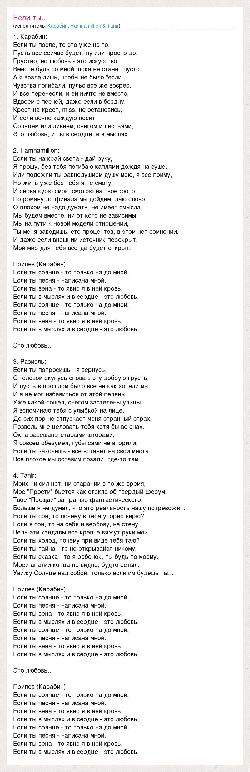 1. Карабин: Если ты после, то это уже не то, Пусть все сейчас будет, ну или просто до. Грустно, но любовь - это искусство, Вместе будь со мной, пока не станет пусто. А я возле лишь, чтобы не было "если", Чувства погибали, пульс все же восрес. И все перенесли, и ей ничто не вместо, Вдвоем с песней, даже если в бездну. Крест-на-крест, miss, не остановись, И если вечно каждую носит Солнцем или ливнем, снегом и листьями, Это любовь, и ты в сердце, и в мыслях. 2. Hamnamillion: Если ты на край света - дай руку, Я прошу, без тебя погибаю каплями дождя на суше, Или подожги ты равнодушием душу мою, я все пойму, Но жить уже без тебя я не смогу. И снова курю смок, смотрю на твое фото, По роману до финала мы дойдем, даю слово. О плохом не надо думать, не имеет смысла, Мы будем вместе, ни от кого не зависимы. Мы на пути к новой модели отношении, Ты меня заводишь, сто процентов, в этом нет сомнении. И даже если внешний источник перекрыт, Мой мир для тебя всегда будет открыт. Припев (Карабин): Если ты солнце - то только на до мной, Если ты песня - написана мной. Если ты вена - то явно я в ней кровь, Если ты в мыслях и в сердце - это любовь. Если ты солнце - то только на до мной, Если ты песня - написана мной. Если ты вена - то явно я в ней кровь, Если ты в мыслях и в сердце - это любовь. Это любовь... 3. Разиэль: Если ты попросишь - я вернусь, С головой окунусь снова в эту добрую грусть. И пусть в прошлом было все не как хотели мы, И я не мог избавиться от этой пелены. Уже какой пошел, снегом застелены улицы, Я вспоминаю тебя с улыбкой на лице. До сих пор не отпускает меня странный страх, Позволь мне целовать тебя хотя бы во снах. Окна завешаны старыми шторами, Я совсем обезумел, губы сами не вторили. Если ты захочешь - все встанет на свои места, Все плохое мы оставим позади, где-то там... 4. Tanir: Моих ни сил нет, ни старании в то же время, Мое "Прости" бьется как стекло об твердый ферум. Твое "Прощай" за гранью фантастического, Больше я не думал, что это реальность нашу потревожит. Если ты сон, то почему в тебя упорно верю? Если я сон, то на себя и вербову, на стену, Ведь эти кандалы все крепче вяжут руки мои. Если ты холод, почему при виде тебя таю? Если ты тайна - то не открывайся никому, Если ты сказка - то я ребенок, ты будь по моему. Моей апатии конца не видно, будто остыл, Увижу Солнце над собой, только если им будешь ты... Припев (Карабин): Если ты солнце - то только на до мной, Если ты песня - написана мной. Если ты вена - то явно я в ней кровь, Если ты в мыслях и в сердце - это любовь. Если ты солнце - то только на до мной, Если ты песня - написана мной. Если ты вена - то явно я в ней кровь, Если ты в мыслях и в сердце - это любовь. Это любовь... Припев (Карабин): Если ты солнце - то только на до мной, Если ты песня - написана мной. Если ты вена - то явно я в ней кровь, Если ты в мыслях и в сердце - это любовь. Если ты солнце - то только на до мной, Если ты песня - написана мной. Если ты вена - то явно я в ней кровь, Если ты в мыслях и в сердце - это любовь.