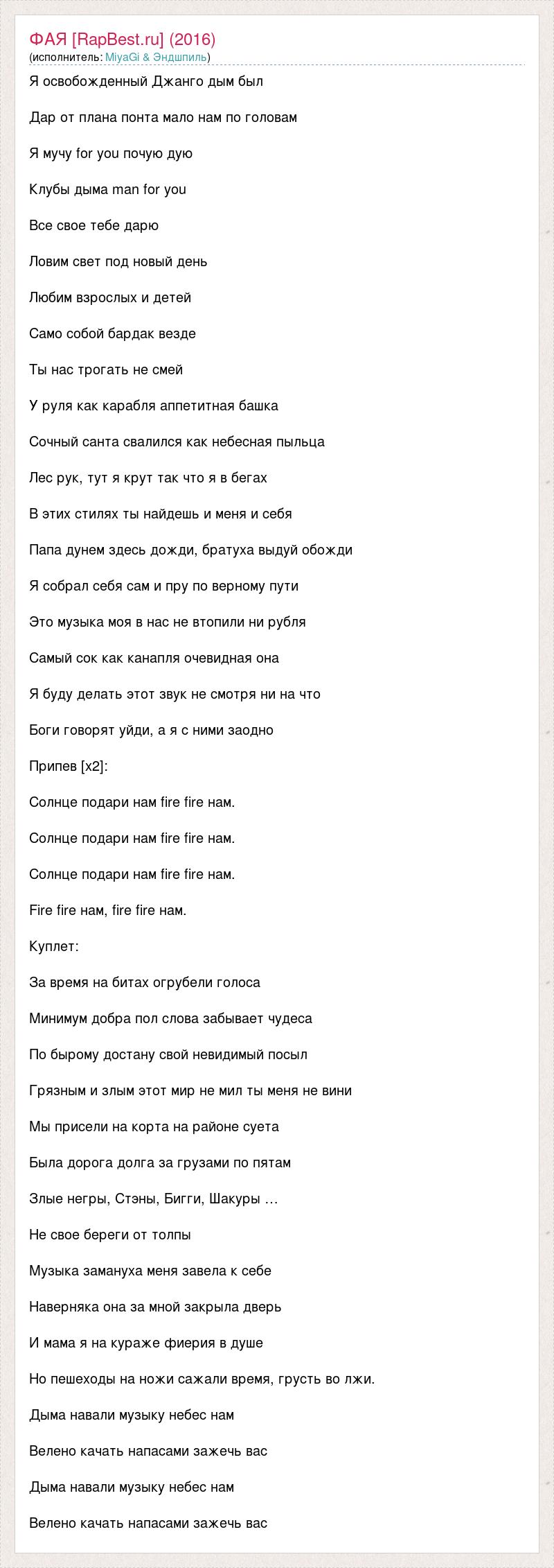 Я освобожденный Джанго дым был Дар от плана понта мало нам по головам Я мучу for you почую дую Клубы дыма man for you Все свое тебе дарю Ловим свет под новый день Любим взрослых и детей Само собой бардак везде Ты нас трогать не смей У руля как карабля аппетитная башка Сочный санта свалился как небесная пыльца Лес рук, тут я крут так что я в бегах В этих стилях ты найдешь и меня и себя Папа дунем здесь дожди, братуха выдуй обожди Я собрал себя сам и пру по верному пути Это музыка моя в нас не втопили ни рубля Самый сок как канапля очевидная она Я буду делать этот звук не смотря ни на что Боги говорят уйди, а я с ними заодно Припев [x2]: Солнце подари нам fire fire нам. Солнце подари нам fire fire нам. Солнце подари нам fire fire нам. Fire fire нам, fire fire нам. Куплет: За время на битах огрубели голоса Минимум добра пол слова забывает чудеса По бырому достану свой невидимый посыл Грязным и злым этот мир не мил ты меня не вини Мы присели на корта на районе суета Была дорога долга за грузами по пятам Злые негры, Стэны, Бигги, Шакуры … Не свое береги от толпы Музыка замануха меня завела к себе Наверняка она за мной закрыла дверь И мама я на кураже фиерия в душе Но пешеходы на ножи сажали время, грусть во лжи. Дыма навали музыку небес нам Велено качать напасами зажечь вас Дыма навали музыку небес нам Велено качать напасами зажечь вас