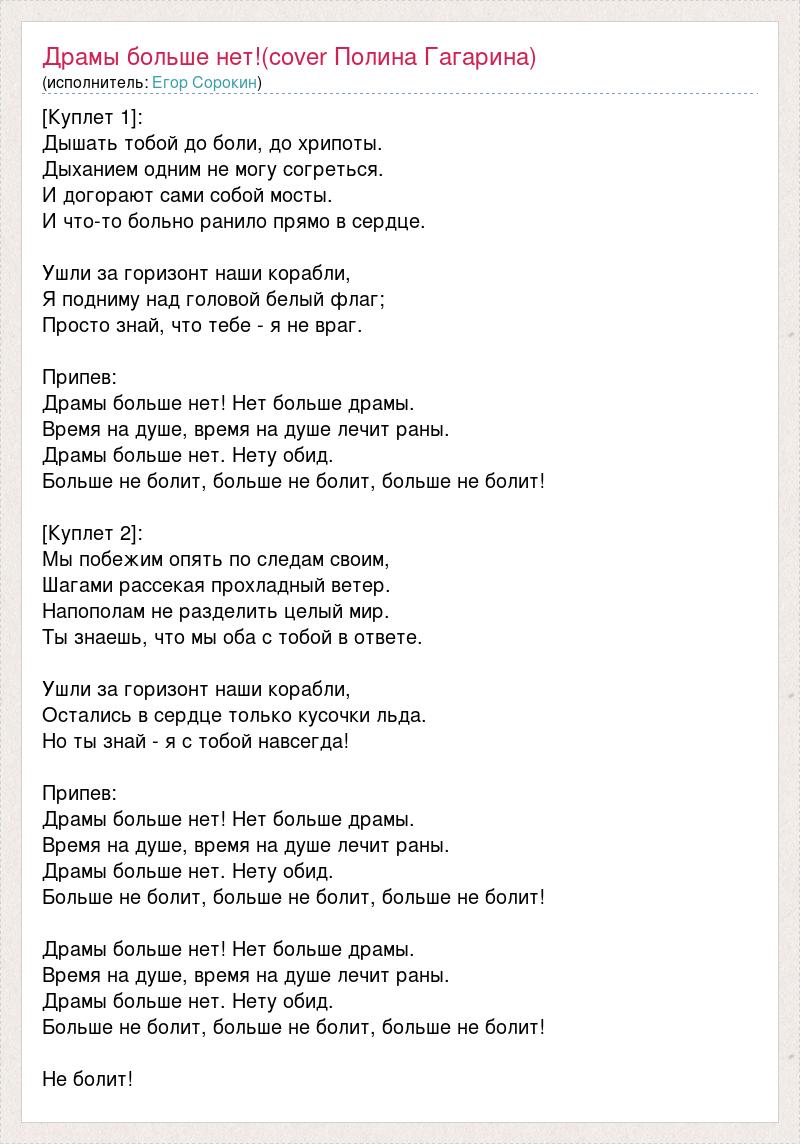 [Куплет 1]: Дышать тобой до боли, до хрипоты. Дыханием одним не могу согреться. И догорают сами собой мосты. И что-то больно ранило прямо в сердце. Ушли за горизонт наши корабли, Я подниму над головой белый флаг; Просто знай, что тебе - я не враг. Припев: Драмы больше нет! Нет больше драмы. Время на душе, время на душе лечит раны. Драмы больше нет. Нету обид. Больше не болит, больше не болит, больше не болит! [Куплет 2]: Мы побежим опять по следам своим, Шагами рассекая прохладный ветер. Напополам не разделить целый мир. Ты знаешь, что мы оба с тобой в ответе. Ушли за горизонт наши корабли, Остались в сердце только кусочки льда. Но ты знай - я с тобой навсегда! Припев: Драмы больше нет! Нет больше драмы. Время на душе, время на душе лечит раны. Драмы больше нет. Нету обид. Больше не болит, больше не болит, больше не болит! Драмы больше нет! Нет больше драмы. Время на душе, время на душе лечит раны. Драмы больше нет. Нету обид. Больше не болит, больше не болит, больше не болит! Не болит!