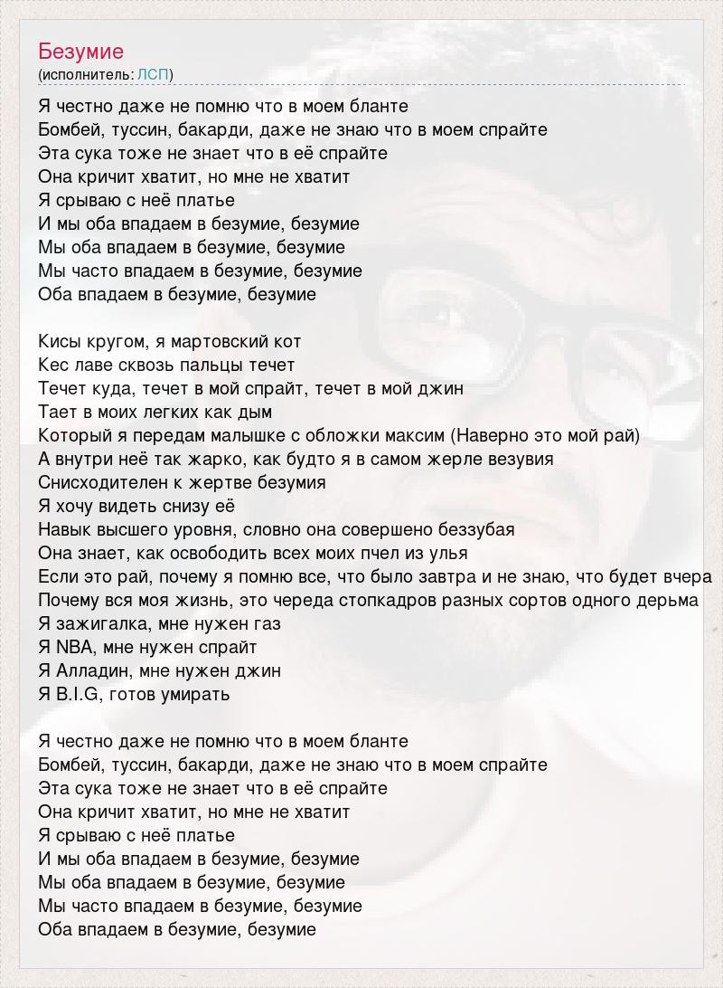 Я честно даже не помню что в моем бланте Бомбей, туссин, бакарди, даже не знаю что в моем спрайте Эта сука тоже не знает что в её спрайте Она кричит хватит, но мне не хватит Я срываю с неё платье И мы оба впадаем в безумие, безумие Мы оба впадаем в безумие, безумие Мы часто впадаем в безумие, безумие Оба впадаем в безумие, безумие Кисы кругом, я мартовский кот Кес лаве сквозь пальцы течет Течет куда, течет в мой спрайт, течет в мой джин Тает в моих легких как дым Который я передам малышке с обложки максим (Наверно это мой рай) А внутри неё так жарко, как будто я в самом жерле везувия Снисходителен к жертве безумия Я хочу видеть снизу её Навык высшего уровня, словно она совершено беззубая Она знает, как освободить всех моих пчел из улья Если это рай, почему я помню все, что было завтра и не знаю, что будет вчера Почему вся моя жизнь, это череда стопкадров разных сортов одного дерьма Я зажигалка, мне нужен газ Я NBA, мне нужен спрайт Я Алладин, мне нужен джин Я B.I.G, готов умирать Я честно даже не помню что в моем бланте Бомбей, туссин, бакарди, даже не знаю что в моем спрайте Эта сука тоже не знает что в её спрайте Она кричит хватит, но мне не хватит Я срываю с неё платье И мы оба впадаем в безумие, безумие Мы оба впадаем в безумие, безумие Мы часто впадаем в безумие, безумие Оба впадаем в безумие, безумие