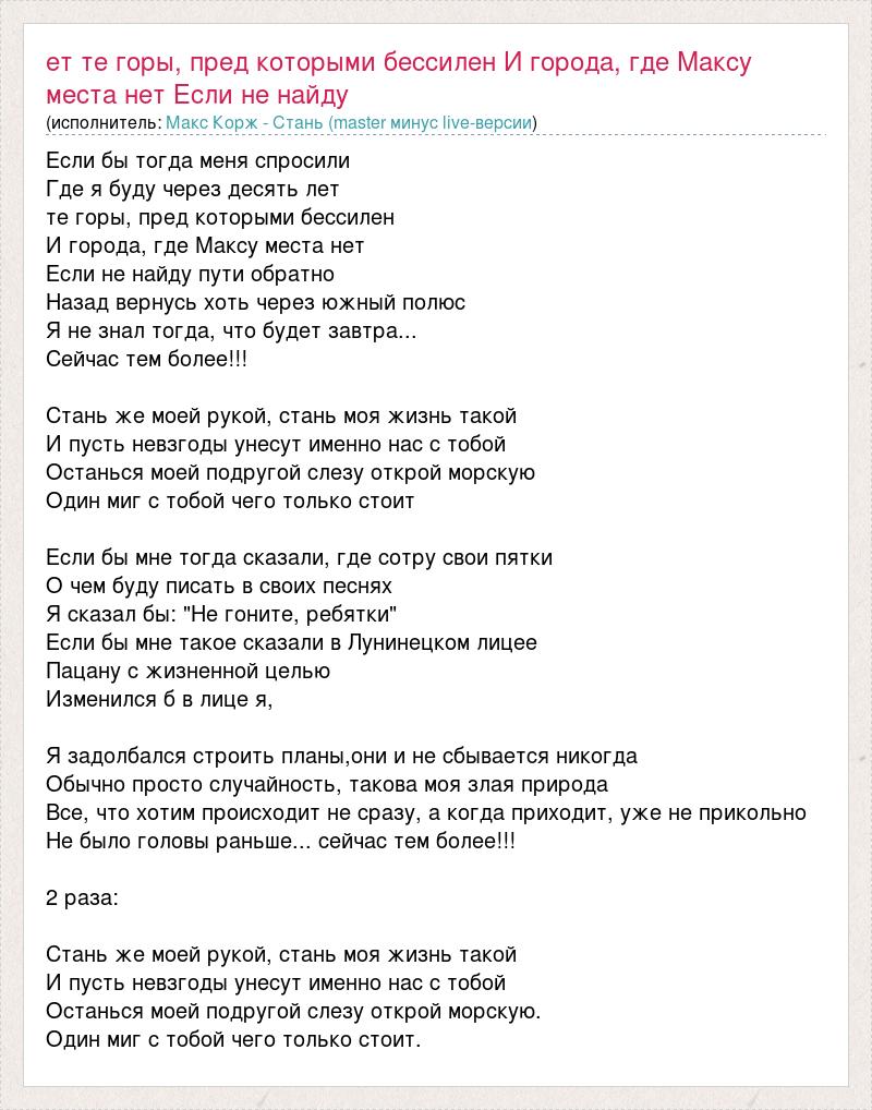 Если бы тогда меня спросили Где я буду через десять лет те горы, пред которыми бессилен И города, где Максу места нет Если не найду пути обратно Назад вернусь хоть через южный полюс Я не знал тогда, что будет завтра... Сейчас тем более!!! Стань же моей рукой, стань моя жизнь такой И пусть невзгоды унесут именно нас с тобой Останься моей подругой слезу открой морскую Один миг с тобой чего только стоит Если бы мне тогда сказали, где сотру свои пятки О чем буду писать в своих песнях Я сказал бы: "Не гоните, ребятки" Если бы мне такое сказали в Лунинецком лицее Пацану с жизненной целью Изменился б в лице я, Я задолбался строить планы,они и не сбывается никогда Обычно просто случайность, такова моя злая природа Все, что хотим происходит не сразу, а когда приходит, уже не прикольно Не было головы раньше... сейчас тем более!!! 2 раза: Стань же моей рукой, стань моя жизнь такой И пусть невзгоды унесут именно нас с тобой Останься моей подругой слезу открой морскую. Один миг с тобой чего только стоит.
