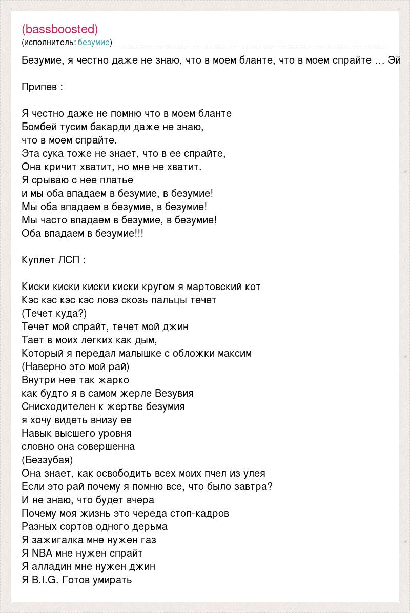 Безумие, я честно даже не знаю, что в моем бланте, что в моем спрайте … Эй Припев : Я честно даже не помню что в моем бланте Бомбей тусим бакарди даже не знаю, что в моем спрайте. Эта сука тоже не знает, что в ее спрайте, Она кричит хватит, но мне не хватит. Я срываю с нее платье и мы оба впадаем в безумие, в безумие! Мы оба впадаем в безумие, в безумие! Мы часто впадаем в безумие, в безумие! Оба впадаем в безумие!!! Куплет ЛСП : Киски киски киски киски кругом я мартовский кот Кэс кэс кэс кэс ловэ скозь пальцы течет (Течет куда?) Течет мой спрайт, течет мой джин Тает в моих легких как дым, Который я передал малышке с обложки максим (Наверно это мой рай) Внутри нее так жарко как будто я в самом жерле Везувия Снисходителен к жертве безумия я хочу видеть внизу ее Навык высшего уровня словно она совершенна (Беззубая) Она знает, как освободить всех моих пчел из улея Если это рай почему я помню все, что было завтра? И не знаю, что будет вчера Почему моя жизнь это череда стоп-кадров Разных сортов одного дерьма Я зажигалка мне нужен газ Я NBA мне нужен спрайт Я алладин мне нужен джин Я B.I.G. Готов умирать