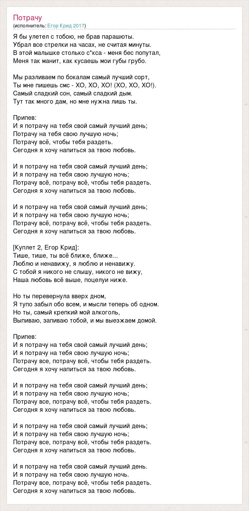 Я бы улетел с тобою, не брав парашюты. Убрал все стрелки на часах, не считая минуты. В этой малышке столько с*кса - меня бес попутал, Меня так манит, как кусаешь мои губы грубо. Мы разливаем по бокалам самый лучший сорт, Ты мне пишешь смс - XO, XO, XO! (XO, XO, XO!). Самый сладкий сон, самый сладкий дым. Тут так много дам, но мне нужна лишь ты. Припев: И я потрачу на тебя свой самый лучший день; Потрачу на тебя свою лучшую ночь; Потрачу всё, чтобы тебя раздеть. Сегодня я хочу напиться за твою любовь. И я потрачу на тебя свой самый лучший день; И я потрачу на тебя свою лучшую ночь; Потрачу всё, потрачу всё, чтобы тебя раздеть. Сегодня я хочу напиться за твою любовь. И я потрачу на тебя свой самый лучший день; И я потрачу на тебя свою лучшую ночь; Потрачу всё, потрачу всё, чтобы тебя раздеть. Сегодня я хочу напиться за твою любовь. [Куплет 2, Егор Крид]: Тише, тише, ты всё ближе, ближе... Люблю и ненавижу, я люблю и ненавижу. С тобой я никого не слышу, никого не вижу, Наша любовь всё выше, поцелуи ниже. Но ты перевернула вверх дном, Я тупо забыл обо всем, и мысли теперь об одном. Но ты, самый крепкий мой алкоголь, Выпиваю, запиваю тобой, и мы выезжаем домой. Припев: И я потрачу на тебя свой самый лучший день; И я потрачу на тебя свою лучшую ночь; Потрачу все, потрачу всё, чтобы тебя раздеть. Сегодня я хочу напиться за твою любовь. И я потрачу на тебя свой самый лучший день; И я потрачу на тебя свою лучшую ночь; Потрачу все, потрачу всё, чтобы тебя раздеть. Сегодня я хочу напиться за твою любовь. И я потрачу на тебя свой самый лучший день; И я потрачу на тебя свою лучшую ночь; Потрачу все, потрачу всё, чтобы тебя раздеть. Сегодня я хочу напиться за твою любовь. И я потрачу на тебя свой самый лучший день. И я потрачу на тебя свою лучшую ночь. Потрачу все, потрачу всё, чтобы тебя раздеть. Сегодня я хочу напиться за твою любовь.