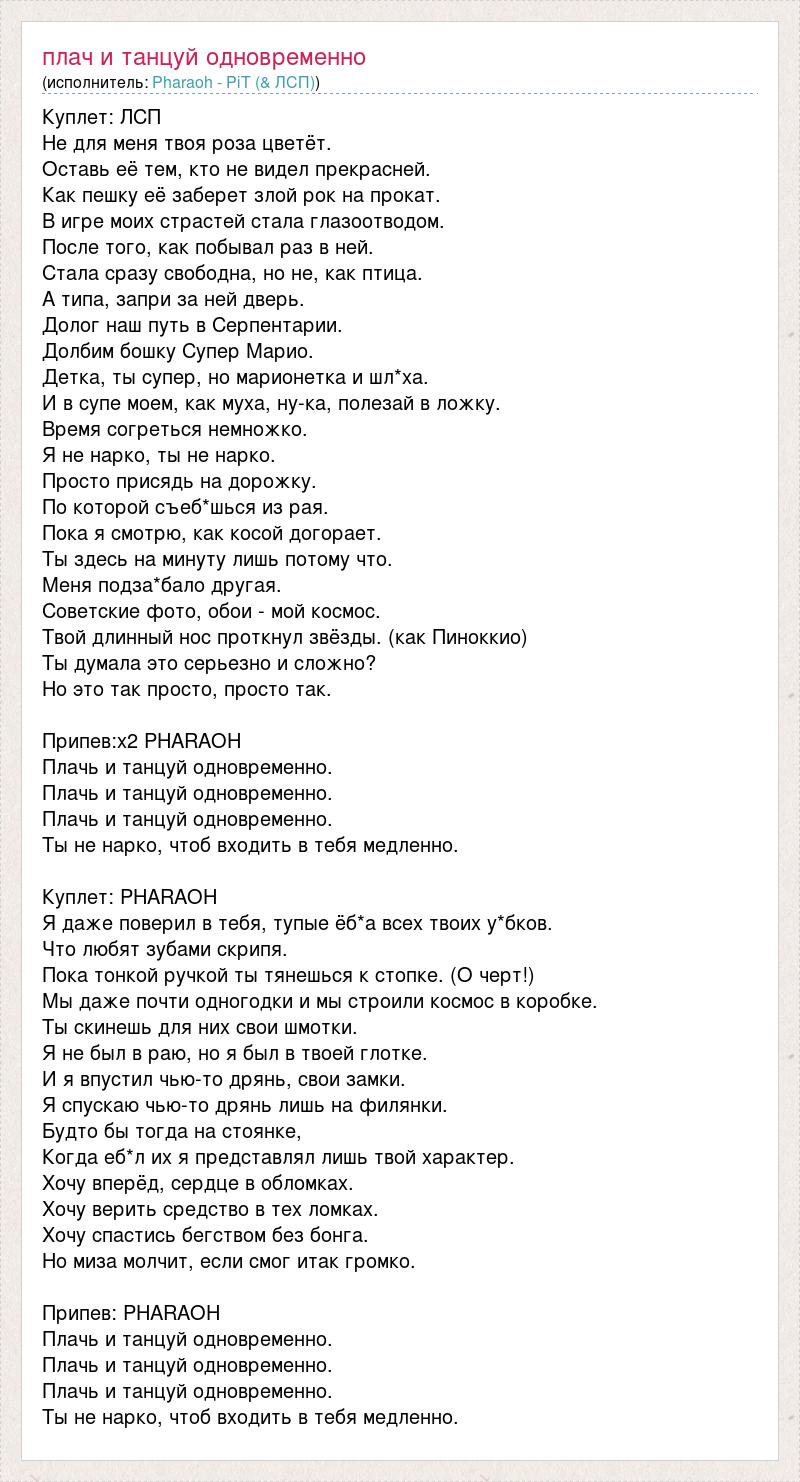 Куплет: ЛСП Не для меня твоя роза цветёт. Оставь её тем, кто не видел прекрасней. Как пешку её заберет злой рок на прокат. В игре моих страстей стала глазоотводом. После того, как побывал раз в ней. Стала сразу свободна, но не, как птица. А типа, запри за ней дверь. Долог наш путь в Серпентарии. Долбим бошку Супер Марио. Детка, ты супер, но марионетка и шл*ха. И в супе моем, как муха, ну-ка, полезай в ложку. Время согреться немножко. Я не нарко, ты не нарко. Просто присядь на дорожку. По которой съеб*шься из рая. Пока я смотрю, как косой догорает. Ты здесь на минуту лишь потому что. Меня подза*бало другая. Советские фото, обои - мой космос. Твой длинный нос проткнул звёзды. (как Пиноккио) Ты думала это серьезно и сложно? Но это так просто, просто так. Припев:х2 PHARAOH Плачь и танцуй одновременно. Плачь и танцуй одновременно. Плачь и танцуй одновременно. Ты не нарко, чтоб входить в тебя медленно. Куплет: PHARAOH Я даже поверил в тебя, тупые ёб*а всех твоих у*бков. Что любят зубами скрипя. Пока тонкой ручкой ты тянешься к стопке. (О черт!) Мы даже почти одногодки и мы строили космос в коробке. Ты скинешь для них свои шмотки. Я не был в раю, но я был в твоей глотке. И я впустил чью-то дрянь, свои замки. Я спускаю чью-то дрянь лишь на филянки. Будто бы тогда на стоянке, Когда еб*л их я представлял лишь твой характер. Хочу вперёд, сердце в обломках. Хочу верить средство в тех ломках. Хочу спастись бегством без бонга. Но миза молчит, если смог итак громко. Припев: PHARAOH Плачь и танцуй одновременно. Плачь и танцуй одновременно. Плачь и танцуй одновременно. Ты не нарко, чтоб входить в тебя медленно.
