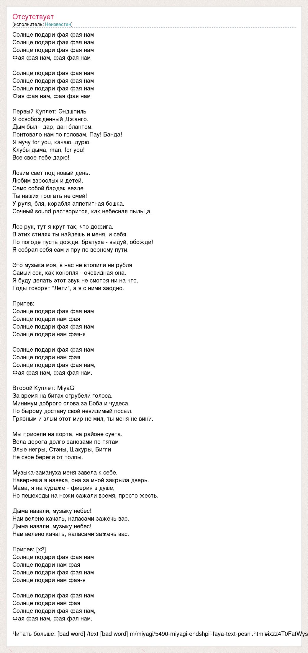 Солнце подари фая фая нам Солнце подари фая фая нам Солнце подари фая фая нам Фая фая нам, фая фая нам Солнце подари фая фая нам Солнце подари фая фая нам Солнце подари фая фая нам Фая фая нам, фая фая нам Первый Куплет: Эндшпиль Я освобожденный Джанго. Дым был - дар, дан блантом. Понтовало нам по головам. Пау! Банда! Я мучу for you, качаю, дурю. Клубы дыма, man, for you! Все свое тебе дарю! Ловим свет под новый день. Любим взрослых и детей. Само собой бардак везде. Ты наших трогать не смей! У руля, бля, корабля аппетитная бошка. Сочный sound растворится, как небесная пыльца. Лес рук, тут я крут так, что дофига. В этих стилях ты найдешь и меня, и себя. По погоде пусть дожди, братуха - выдуй, обожди! Я собрал себя сам и пру по верному пути. Это музыка моя, в нас не втопили ни рубля Самый сок, как конопля - очевидная она. Я буду делать этот звук не смотря ни на что. Годы говорят "Лети", а я с ними заодно. Припев: Солнце подари фая фая нам Солнце подари нам фая Солнце подари фая фая нам Солнце подари нам фая-я Солнце подари фая фая нам Солнце подари нам фая Солнце подари фая фая нам, Фая фая нам, фая фая нам. Второй Куплет: MiyaGi За время на битах огрубели голоса. Минимум доброго слова,за Боба и чудеса. По бырому достану свой невидимый посыл. Грязным и злым этот мир не мил, ты меня не вини. Мы присели на корта, на районе суета. Вела дорога долго занозами по пятам Злые негры, Стэны, Шакуры, Бигги Не свое береги от толпы. Музыка-замануха меня завела к себе. Наверняка я навека, она за мной закрыла дверь. Мама, я на кураже - фиерия в душе, Но пешеходы на ножи сажали время, просто жесть. Дыма навали, музыку небес! Нам велено качать, напасами зажечь вас. Дыма навали, музыку небес! Нам велено качать, напасами зажечь вас. Припев: [х2] Солнце подари фая фая нам Солнце подари нам фая Солнце подари фая фая нам Солнце подари нам фая-я Солнце подари фая фая нам Солнце подари нам фая Солнце подари фая фая нам, Фая фая нам, фая фая нам. Читать больше: [bad word] /text [bad word] m/miyagi/5490-miyagi-endshpil-faya-text-pesni.html#ixzz4T0FatWys