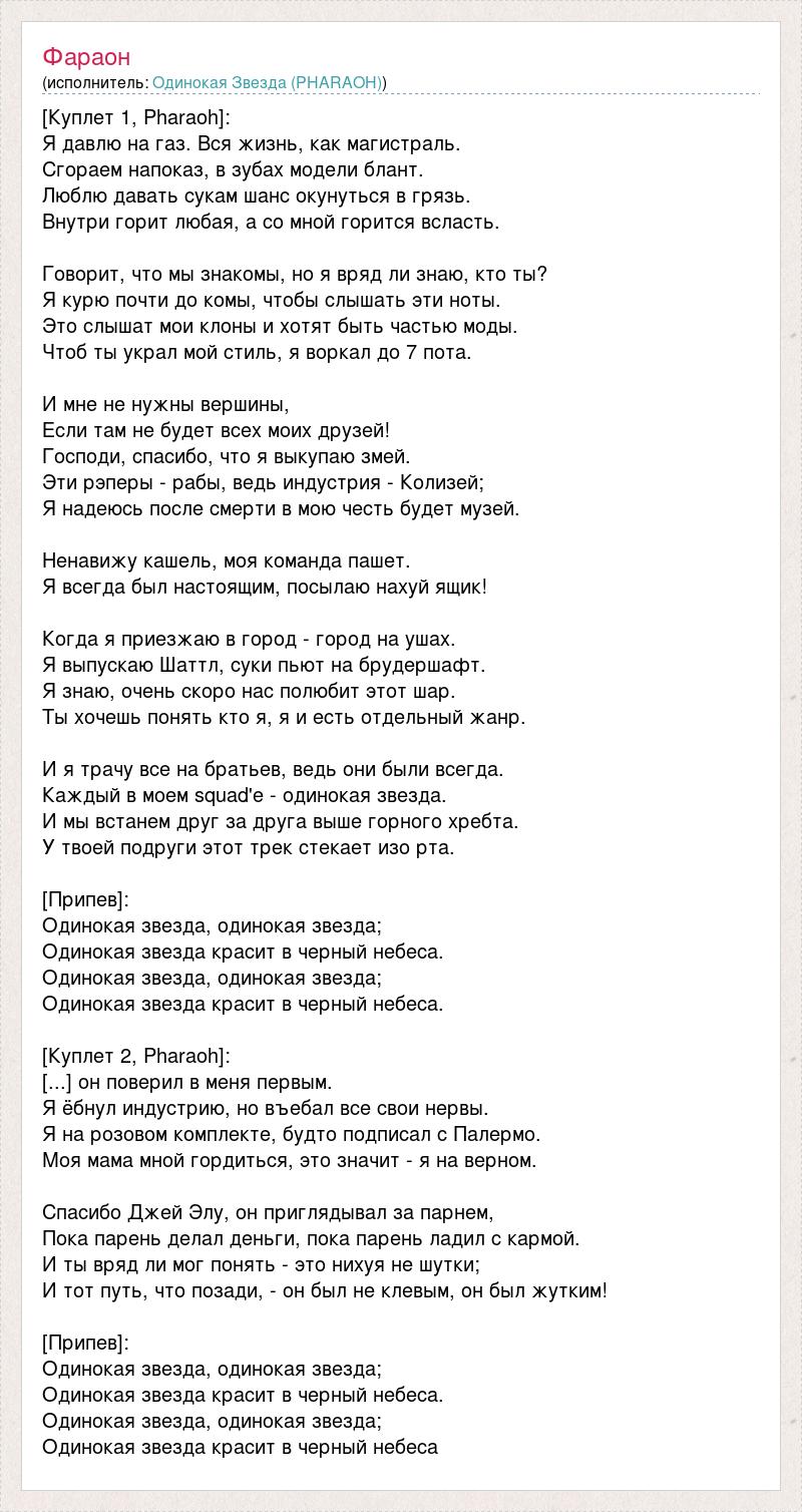 [Куплет 1, Pharaoh]: Я давлю на газ. Вся жизнь, как магистраль. Сгораем напоказ, в зубах модели блант. Люблю давать сукам шанс окунуться в грязь. Внутри горит любая, а со мной горится всласть. Говорит, что мы знакомы, но я вряд ли знаю, кто ты? Я курю почти до комы, чтобы слышать эти ноты. Это слышат мои клоны и хотят быть частью моды. Чтоб ты украл мой стиль, я воркал до 7 пота. И мне не нужны вершины, Если там не будет всех моих друзей! Господи, спасибо, что я выкупаю змей. Эти рэперы - рабы, ведь индустрия - Колизей; Я надеюсь после смерти в мою честь будет музей. Ненавижу кашель, моя команда пашет. Я всегда был настоящим, посылаю нахуй ящик! Когда я приезжаю в город - город на ушах. Я выпускаю Шаттл, суки пьют на брудершафт. Я знаю, очень скоро нас полюбит этот шар. Ты хочешь понять кто я, я и есть отдельный жанр. И я трачу все на братьев, ведь они были всегда. Каждый в моем squad'е - одинокая звезда. И мы встанем друг за друга выше горного хребта. У твоей подруги этот трек стекает изо рта. [Припев]: Одинокая звезда, одинокая звезда; Одинокая звезда красит в черный небеса. Одинокая звезда, одинокая звезда; Одинокая звезда красит в черный небеса. [Куплет 2, Pharaoh]: [...] он поверил в меня первым. Я ёбнул индустрию, но въебал все свои нервы. Я на розовом комплекте, будто подписал с Палермо. Моя мама мной гордиться, это значит - я на верном. Спасибо Джей Элу, он приглядывал за парнем, Пока парень делал деньги, пока парень ладил с кармой. И ты вряд ли мог понять - это нихуя не шутки; И тот путь, что позади, - он был не клевым, он был жутким! [Припев]: Одинокая звезда, одинокая звезда; Одинокая звезда красит в черный небеса. Одинокая звезда, одинокая звезда; Одинокая звезда красит в черный небеса