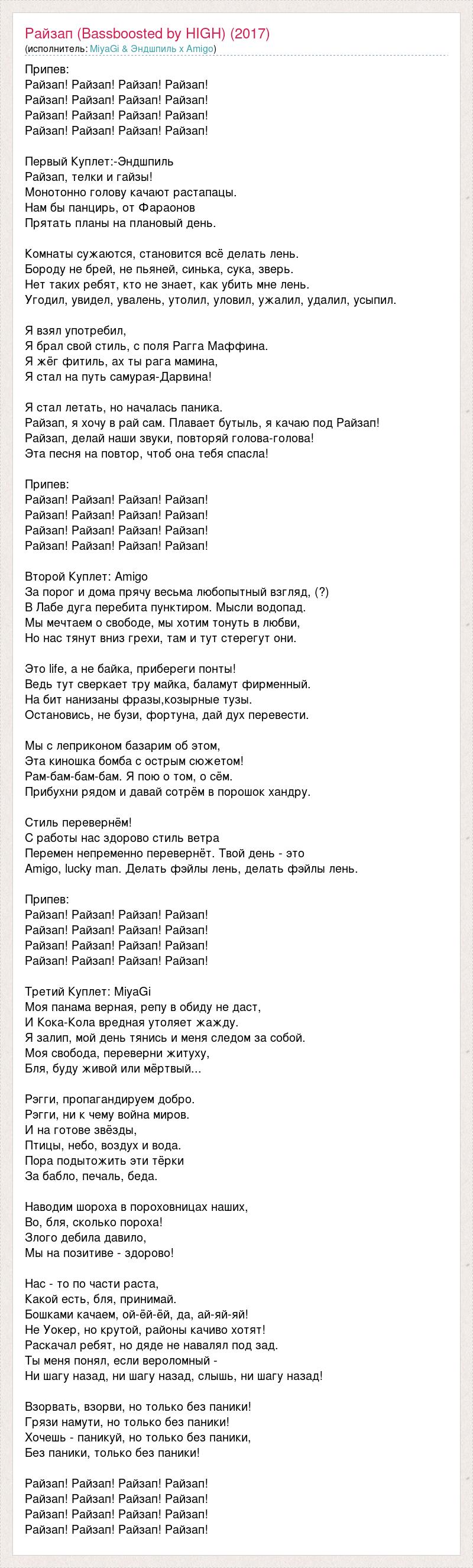 Припев: Райзап! Райзап! Райзап! Райзап! Райзап! Райзап! Райзап! Райзап! Райзап! Райзап! Райзап! Райзап! Райзап! Райзап! Райзап! Райзап! Первый Куплет:-Эндшпиль Райзап, телки и гайзы! Монотонно голову качают растапацы. Нам бы панцирь, от Фараонов Прятать планы на плановый день. Комнаты сужаются, становится всё делать лень. Бороду не брей, не пьяней, синька, сука, зверь. Нет таких ребят, кто не знает, как убить мне лень. Угодил, увидел, увалень, утолил, уловил, ужалил, удалил, усыпил. Я взял употребил, Я брал свой стиль, с поля Рагга Маффина. Я жёг фитиль, ах ты рага мамина, Я стал на путь самурая-Дарвина! Я стал летать, но началась паника. Райзап, я хочу в рай сам. Плавает бутыль, я качаю под Райзап! Райзап, делай наши звуки, повторяй голова-голова! Эта песня на повтор, чтоб она тебя спасла! Припев: Райзап! Райзап! Райзап! Райзап! Райзап! Райзап! Райзап! Райзап! Райзап! Райзап! Райзап! Райзап! Райзап! Райзап! Райзап! Райзап! Второй Куплет: Amigo За порог и дома прячу весьма любопытный взгляд, (?) В Лабе дуга перебита пунктиром. Мысли водопад. Мы мечтаем о свободе, мы хотим тонуть в любви, Но нас тянут вниз грехи, там и тут стерегут они. Это life, а не байка, прибереги понты! Ведь тут сверкает тру майка, баламут фирменный. На бит нанизаны фразы,козырные тузы. Остановись, не бузи, фортуна, дай дух перевести. Мы с леприконом базарим об этом, Эта киношка бомба с острым сюжетом! Рам-бам-бам-бам. Я пою о том, о сём. Прибухни рядом и давай сотрём в порошок хандру. Стиль перевернём! С работы нас здорово стиль ветра Перемен непременно перевернёт. Твой день - это Amigo, lucky man. Делать фэйлы лень, делать фэйлы лень. Припев: Райзап! Райзап! Райзап! Райзап! Райзап! Райзап! Райзап! Райзап! Райзап! Райзап! Райзап! Райзап! Райзап! Райзап! Райзап! Райзап! Третий Куплет: MiyaGi Моя панама верная, репу в обиду не даст, И Кока-Кола вредная утоляет жажду. Я залип, мой день тянись и меня следом за собой. Моя свобода, переверни житуху, Бля, буду живой или мёртвый... Рэгги, пропагандируем добро. Рэгги, ни к чему война миров. И на готове звёзды, Птицы, небо, воздух и вода. Пора подытожить эти тёрки За бабло, печаль, беда. Наводим шороха в пороховницах наших, Во, бля, сколько пороха! Злого дебила давило, Мы на позитиве - здорово! Нас - то по части раста, Какой есть, бля, принимай. Бошками качаем, ой-ёй-ёй, да, ай-яй-яй! Не Уокер, но крутой, районы качиво хотят! Раскачал ребят, но дяде не навалял под зад. Ты меня понял, если вероломный - Ни шагу назад, ни шагу назад, слышь, ни шагу назад! Взорвать, взорви, но только без паники! Грязи намути, но только без паники! Хочешь - паникуй, но только без паники, Без паники, только без паники! Райзап! Райзап! Райзап! Райзап! Райзап! Райзап! Райзап! Райзап! Райзап! Райзап! Райзап! Райзап! Райзап! Райзап! Райзап! Райзап!