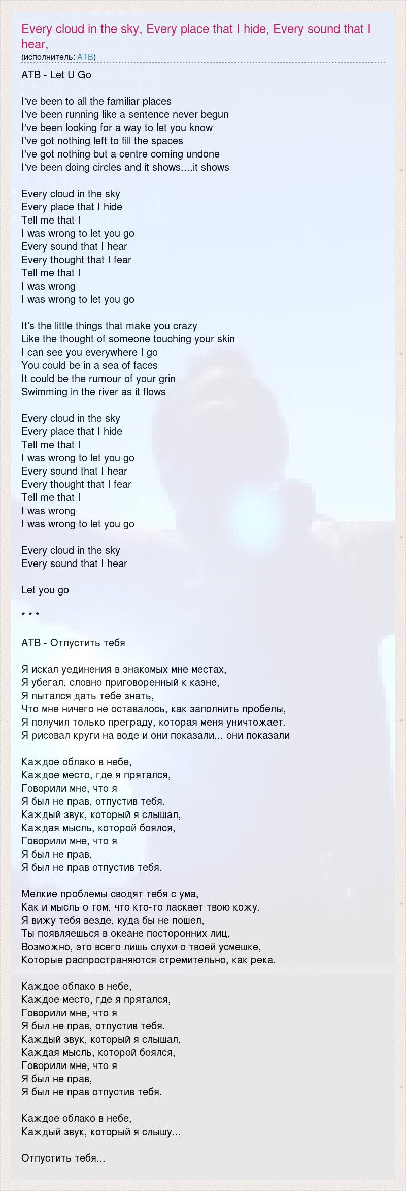 ATB - Let U Go I've been to all the familiar places I've been running like a sentence never begun I've been looking for a way to let you know I've got nothing left to fill the spaces I've got nothing but a centre coming undone I've been doing circles and it shows....it shows Every cloud in the sky Every place that I hide Tell me that I I was wrong to let you go Every sound that I hear Every thought that I fear Tell me that I I was wrong I was wrong to let you go It’s the little things that make you crazy Like the thought of someone touching your skin I can see you everywhere I go You could be in a sea of faces It could be the rumour of your grin Swimming in the river as it flows Every cloud in the sky Every place that I hide Tell me that I I was wrong to let you go Every sound that I hear Every thought that I fear Tell me that I I was wrong I was wrong to let you go Every cloud in the sky Every sound that I hear Let you go * * * АТВ - Отпустить тебя Я искал уединения в знакомых мне местах, Я убегал, словно приговоренный к казне, Я пытался дать тебе знать, Что мне ничего не оставалось, как заполнить пробелы, Я получил только преграду, которая меня уничтожает. Я рисовал круги на воде и они показали... они показали Каждое облако в небе, Каждое место, где я прятался, Говорили мне, что я Я был не прав, отпустив тебя. Каждый звук, который я слышал, Каждая мысль, которой боялся, Говорили мне, что я Я был не прав, Я был не прав отпустив тебя. Мелкие проблемы сводят тебя с ума, Как и мысль о том, что кто-то ласкает твою кожу. Я вижу тебя везде, куда бы не пошел, Ты появляешься в океане посторонних лиц, Возможно, это всего лишь слухи о твоей усмешке, Которые распространяются стремительно, как река. Каждое облако в небе, Каждое место, где я прятался, Говорили мне, что я Я был не прав, отпустив тебя. Каждый звук, который я слышал, Каждая мысль, которой боялся, Говорили мне, что я Я был не прав, Я был не прав отпустив тебя. Каждое облако в небе, Каждый звук, который я слышу... Отпустить тебя...