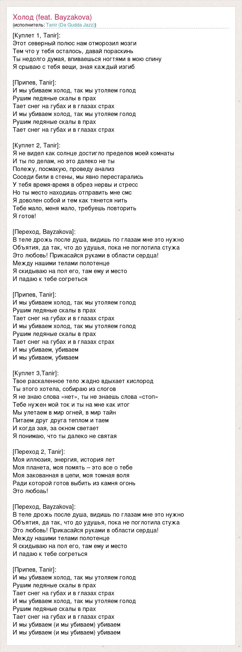 [Куплет 1, Tanir]: Этот северный полюс нам отморозил мозги Тем что у тебя осталось, давай пораскинь Ты недолго думая, впиваешься ногтями в мою спину Я срываю с тебя вещи, зная каждый изгиб [Припев, Tanir]: И мы убиваем холод, так мы утоляем голод Рушим ледяные скалы в прах Тает снег на губах и в глазах страх И мы убиваем холод, так мы утоляем голод Рушим ледяные скалы в прах Тает снег на губах и в глазах страх [Куплет 2, Tanir]: Я не видел как солнце достигло пределов моей комнаты И ты по делам, но это далеко не ты Полежу, посмакую, проведу анализ Соседи били в стены, мы явно перестарались У тебя время-время в обрез нервы и стресс Но ты место находишь отправить мне смс Я доволен собой и тем как тянется нить Тебе мало, меня мало, требуешь повторить Я готов! [Переход, Bayzakova]: В теле дрожь после душа, видишь по глазам мне это нужно Объятия, да так, что до удушья, пока не поглотила стужа Это любовь! Прикасайся руками в области сердца! Между нашими телами полотенце Я скидываю на пол его, там ему и место И падаю к тебе согреться [Припев, Tanir]: И мы убиваем холод, так мы утоляем голод Рушим ледяные скалы в прах Тает снег на губах и в глазах страх И мы убиваем холод, так мы утоляем голод Рушим ледяные скалы в прах Тает снег на губах и в глазах страх И мы убиваем, убиваем И мы убиваем, убиваем [Куплет 3,Tanir]: Твое раскаленное тело жадно вдыхает кислород Ты этого хотела, собираю из слогов Я не знаю слова «нет», ты не знаешь слова «стоп» Тебе нужен мой ток и ты на мне как итог Мы улетаем в мир огней, в мир тайн Питаем друг друга теплом и таем И когда зая, за окном светает Я понимаю, что ты далеко не святая [Переход 2, Tanir]: Моя иллюзия, энергия, история лет Моя планета, моя помять – это все о тебе Моя закованная в цепи, моя томная воля Ради которой готов выбить из камня огонь Это любоаь! [Переход, Bayzakova]: В теле дрожь после душа, видишь по глазам мне это нужно Объятия, да так, что до удушья, пока не поглотила стужа Это любовь! Прикасайся руками в области сердца! Между нашими телами полотенце Я скидываю на пол его, там ему и место И падаю к тебе согреться [Припев, Tanir]: И мы убиваем холод, так мы утоляем голод Рушим ледяные скалы в прах Тает снег на губах и в глазах страх И мы убиваем холод, так мы утоляем голод Рушим ледяные скалы в прах Тает снег на губах и в глазах страх И мы убиваем (и мы убиваем) убиваем И мы убиваем (и мы убиваем) убиваем