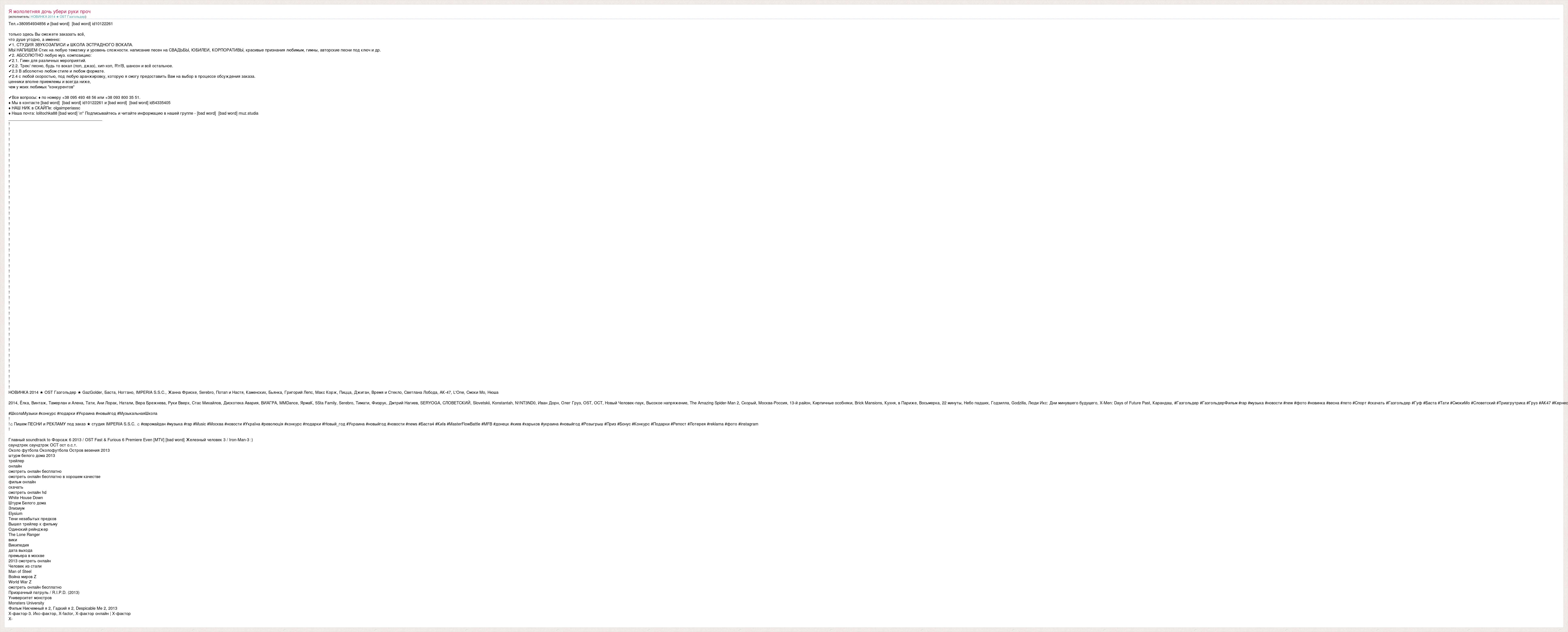 Тел.+380954934856 и [bad word] [bad word] id10122261 только здесь Вы сможете заказать всё, что душе угодно, а именно: ✔1. СТУДИЯ ЗВУКОЗАПИСИ и ШКОЛА ЭСТРАДНОГО ВОКАЛА. МЫ НАПИШЕМ Стих на любую тематику и уровень сложности. написание песен на СВАДЬБЫ, ЮБИЛЕИ, КОРПОРАТИВЫ, красивые признания любимым, гимны, авторские песни под ключ и др. ✔2. АБСОЛЮТНО любую муз. композицию: ✔2.1. Гимн для различных мероприятий. ✔2.2. Трек/ песню, будь то вокал (поп, джаз), хип-хоп, R'n'B, шансон и всё остальное. ✔2.3 В абсолютно любом стиле и любом формате. ✔2.4 с любой скоростью, под любую аранжировку, которую я смогу предоставить Вам на выбор в процессе обсуждения заказа. ценники вполне приемлемы и всегда ниже, чем у моих любимых "конкурентов" ✔Все вопросы: ♦ по номеру +38 095 493 48 56 или +38 093 800 35 51. ♦ Мы в контакте [bad word] [bad word] id10122261 и [bad word] [bad word] id54335405 ♦ НАШ НИК в СКАЙПе: olgaimperiassc ♦ Наша почта: lolitochka88 [bad word] * Подписывайтесь и читайте информацию в нашей группе - [bad word] [bad word] muz.studia __________________________________________ ! ! ! ! ! ! ! ! ! ! ! ! ! ! ! ! ! ! ! ! ! ! ! ! ! ! ! ! ! ! ! ! ! ! ! ! ! ! ! ! ! ! ! ! ! ! ! ! ! ! ! НОВИНКА 2014 ★ OST Газгольдер ★ GazGolder, Баста, Ноггано, IMPERIA S.S.C., Жанна Фриске, Serebro, Потап и Настя, Каменских, Бьянка, Григорий Лепс, Макс Корж, Пицца, Джиган, Время и Стекло, Светлана Лобода, АК-47, L'One, Смоки Мо, Нюша 2014, Ёлка, Винтаж, Тамерлан и Алена, Тати, Ани Лорак, Натали, Вера Брежнева, Руки Вверх, Стас Михайлов, Дискотека Авария, ВИАГРА, MMDance, ЯрмаК, 5Sta Family, Serebro, Тимати, Физрук, Дмтрий Нагиев, SERYOGA, СЛОВЕТСКИЙ, Slovetskii, Konstantah, N1NT3ND0, Иван Дорн, Олег Груз, OST, ОСТ, Новый Человек-паук, Высокое напряжение, The Amazing Spider-Man 2, Скорый, Москва-Россия, 13-й район, Кирпичные особняки, Brick Mansions, Кухня, в Париже, Восьмерка, 22 минуты, Небо падших, Годзилла, Godzilla, Люди Икс: Дни минувшего будущего, X-Men: Days of Future Past, Карандаш, #Газгольдер #ГазгольдерФильм #rap #музыка #новости #new #фото #новинка #весна #лето #Спорт #скачать #Газгольдер #Гуф #Баста #Тати #СмокиМо #Словетский #Триагрутрика #Груз #АК47 #Кернес #ШколаМузыки #конкурс #подарки #Украина #новыйгод #МузыкальнаяШкола ! !♫ Пишем ПЕСНИ и РЕКЛАМУ под заказ ★ студия IMPERIA S.S.C. ♫ #євромайдан #музыка #rap #Music #Москва #новости #Україна #революція #конкурс #подарки #Новый_год #Украина #новыйгод #новости #news #Баста4 #Київ #MasterFlowBattle #MFB #донецк #киев #харьков #украина #новыйгод #Розыгрыш #Приз #Бонус #Конкурс #Подарки #Репост #Лотерея #reklama #фото #instagram ! Главный soundtrack to Форсаж 6 2013 / OST Fast & Furious 6 Premiere Even [MTV] [bad word] Железный человек 3 / Iron-Man-3 :) саундтрек саундтрэк ОСТ ост о.с.т. Около футбола Околофутбола Остров везения 2013 штурм белого дома 2013 трейлер онлайн смотреть онлайн бесплатно смотреть онлайн бесплатно в хорошем качестве фильм онлайн скачать смотреть онлайн hd White House Down Штурм Белого дома Элизиум Elysium Тени незабытых предков Вышел трейлер к фильму Одинокий рейнджер The Lone Ranger вики Википедия дата выхода премьера в москве 2013 смотреть онлайн Человек из стали Man of Steel Война миров Z World War Z смотреть онлайн бесплатно Призрачный патруль / R.I.P.D. (2013) Университет монстров Monsters University Фильм Никчемный я 2, Гадкий я 2, Despicable Me 2, 2013 Х-фактор-3. Икс-фактор, X-factor, Х-фактор онлайн | Х-фактор Х-