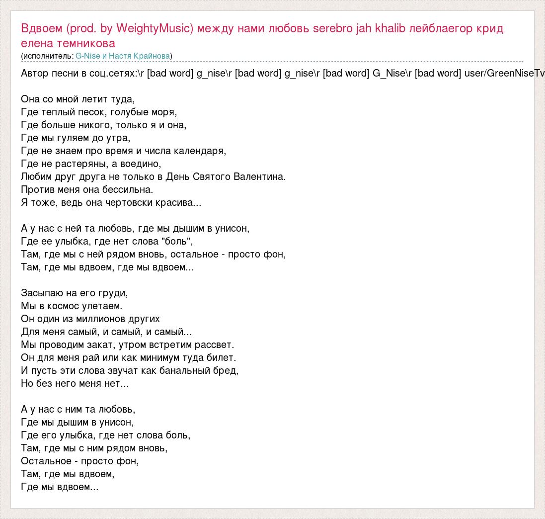 ГлавнаяИсполнителиG-Nise и Настя КрайноваВдвоем (prod. by WeightyMusic) между нами любовь serebro jah khalib лейблаего