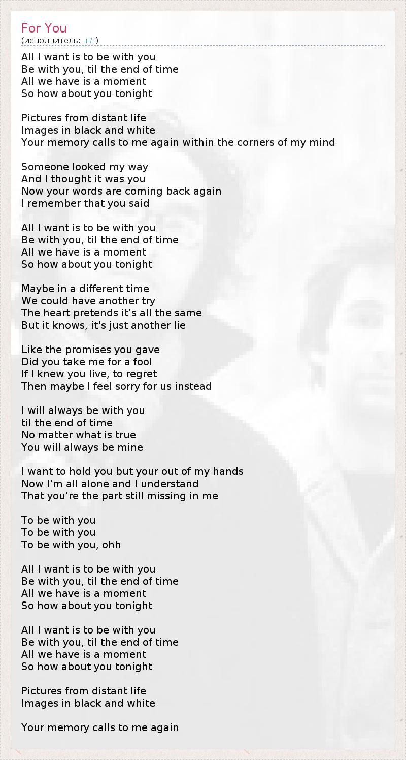 All I want is to be with you Be with you, til the end of time All we have is a moment So how about you tonight Pictures from distant life Images in black and white Your memory calls to me again within the corners of my mind Someone looked my way And I thought it was you Now your words are coming back again I remember that you said All I want is to be with you Be with you, til the end of time All we have is a moment So how about you tonight Maybe in a different time We could have another try The heart pretends it's all the same But it knows, it's just another lie Like the promises you gave Did you take me for a fool If I knew you live, to regret Then maybe I feel sorry for us instead I will always be with you til the end of time No matter what is true You will always be mine I want to hold you but your out of my hands Now I'm all alone and I understand That you're the part still missing in me To be with you To be with you To be with you, ohh All I want is to be with you Be with you, til the end of time All we have is a moment So how about you tonight All I want is to be with you Be with you, til the end of time All we have is a moment So how about you tonight Pictures from distant life Images in black and white Your memory calls to me again