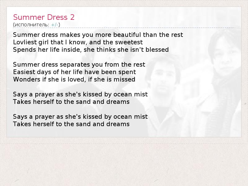 Благодаря летнему платью ты красивее других, Самая милая девушка, которую я знаю, и самая сладкая, Которая расточает свою жизнь внутри себя, полагая, что у нее нет благословения. Благодаря летнему платью ты отделена от других. Она провела свои самые безмятежные дни, Размышляя, любят ли ее, тоскуют ли по ней. Она говорит молитву, пока ее целует туман океана, Отдавая себя песку и мечтам. Она говорит молитву, пока ее целует туман океана, Отдавая себя песку и мечтам.