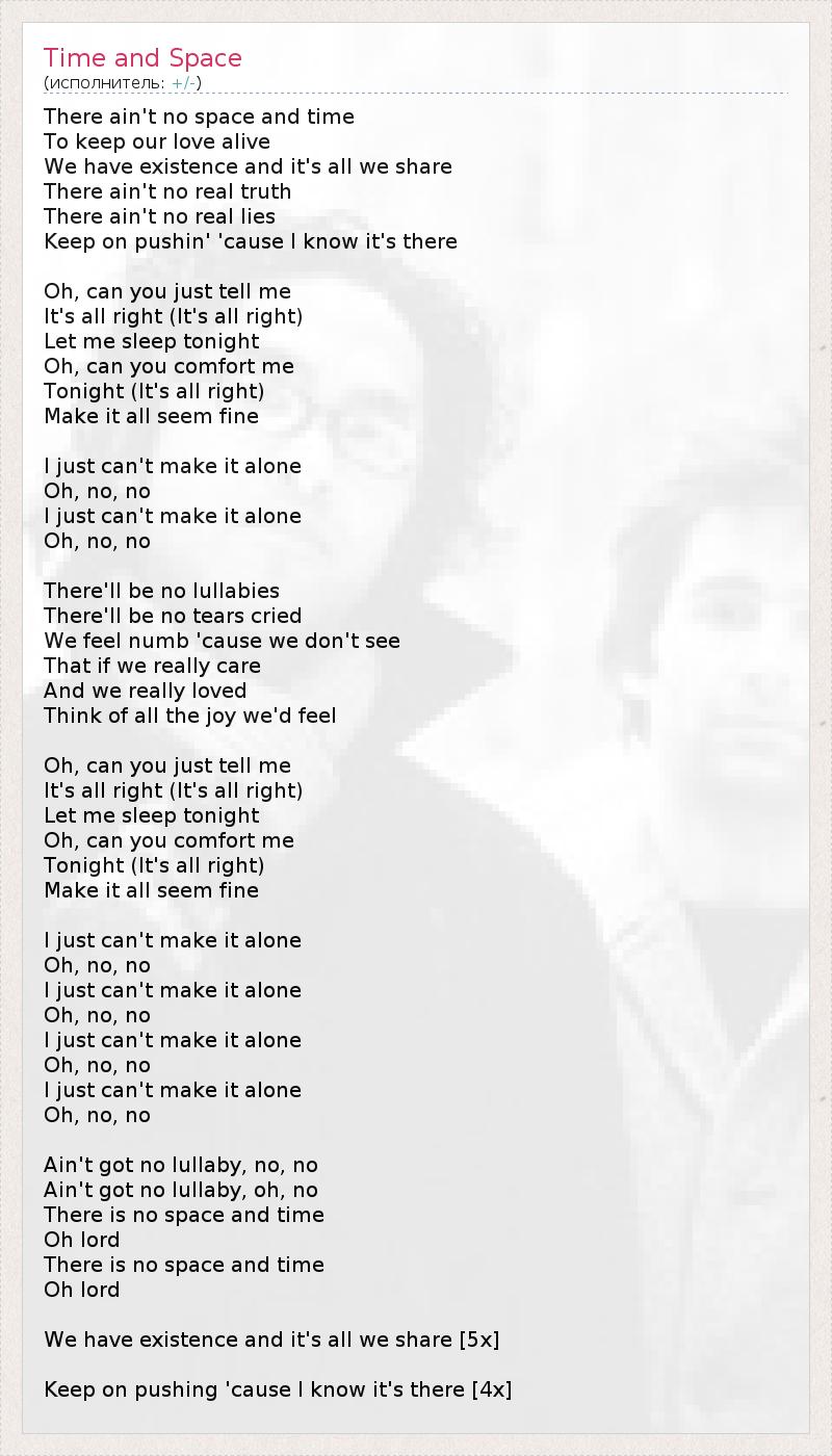Нет пространства и времени, Чтобы сохранить нашу любовь. Мы существуем, и это единственное, что нас объединяет. Нет настоящей правды, Нет настоящей лжи, Но не нужно отступать – я знаю, там что-то есть... О, можешь ли ты просто сказать мне, Что все хорошо (все хорошо), Чтобы я наконец-то уснул. О, можешь ли ты успокоить меня Этой ночью (все хорошо), Чтобы казалось, что все отлично. Я не могу сделать это один, О, нет, нет, нет. Я не могу сделать это один, О, нет, нет, нет. Не будет колыбельных, Не будет слез. И нам нечего сказать лишь потому, что мы не понимаем, Если все это важно для нас И мы действительно любимы, То нужно думать о счастье, которое мы можем ощутить. О, можешь ли ты просто сказать мне, Что все хорошо (все хорошо), Чтобы я наконец-то уснул. О, можешь ли ты успокоить меня Этой ночью (все хорошо), Чтобы казалось, что все отлично. Я не могу сделать это один, О, нет, нет, нет. Я не могу сделать это один, О, нет, нет, нет. Я не могу сделать это один, О, нет, нет, нет. Я не могу сделать это один, О, нет, нет, нет. Больше нет колыбельной, нет, нет, Больше нет колыбельной, о, нет. Нет пространства и времени, О, Боже, Нет пространства и времени, О, Боже. Мы существуем, и это единственное, что нас объединяет [5x] Но не нужно отступать – я знаю, цель совсем близко... [4x]