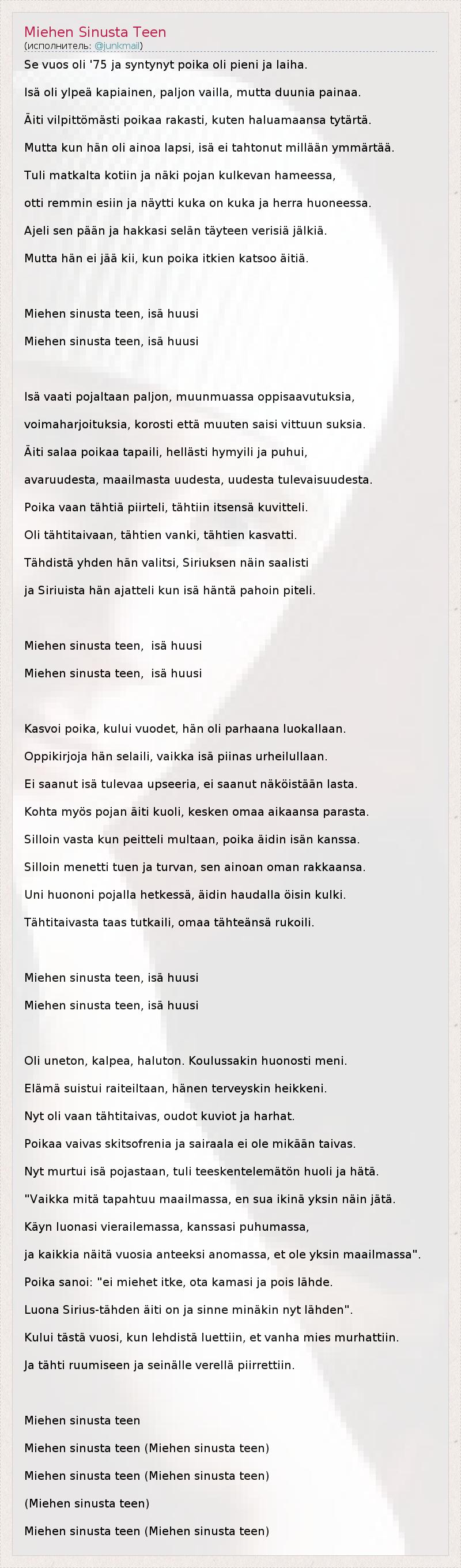 А как ты думаешь, о чем песня "Miehen Sinusta Teen" ?