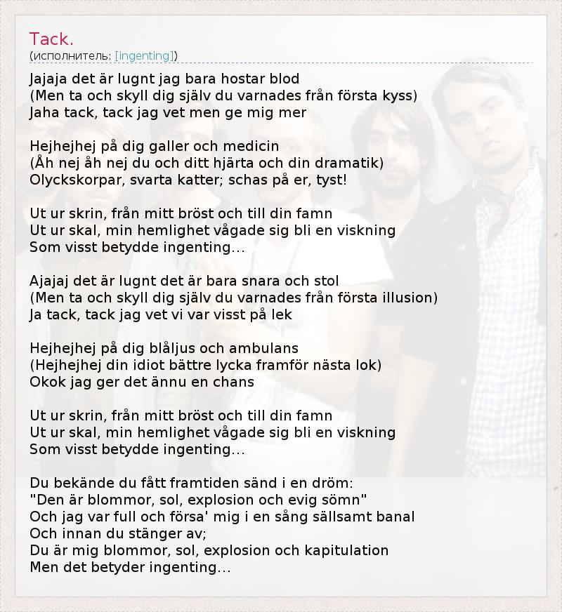 Jajaja det är lugnt jag bara hostar blod (Men ta och skyll dig själv du varnades från första kyss) Jaha tack, tack jag vet men ge mig mer Hejhejhej på dig galler och medicin (Åh nej åh nej du och ditt hjärta och din dramatik) Olyckskorpar, svarta katter; schas på er, tyst! Ut ur skrin, från mitt bröst och till din famn Ut ur skal, min hemlighet vågade sig bli en viskning Som visst betydde ingenting… Ajajaj det är lugnt det är bara snara och stol (Men ta och skyll dig själv du varnades från första illusion) Ja tack, tack jag vet vi var visst på lek Hejhejhej på dig blåljus och ambulans (Hejhejhej din idiot bättre lycka framför nästa lok) Okok jag ger det ännu en chans Ut ur skrin, från mitt bröst och till din famn Ut ur skal, min hemlighet vågade sig bli en viskning Som visst betydde ingenting… Du bekände du fått framtiden sänd i en dröm: "Den är blommor, sol, explosion och evig sömn" Och jag var full och försa' mig i en sång sällsamt banal Och innan du stänger av; Du är mig blommor, sol, explosion och kapitulation Men det betyder ingenting…