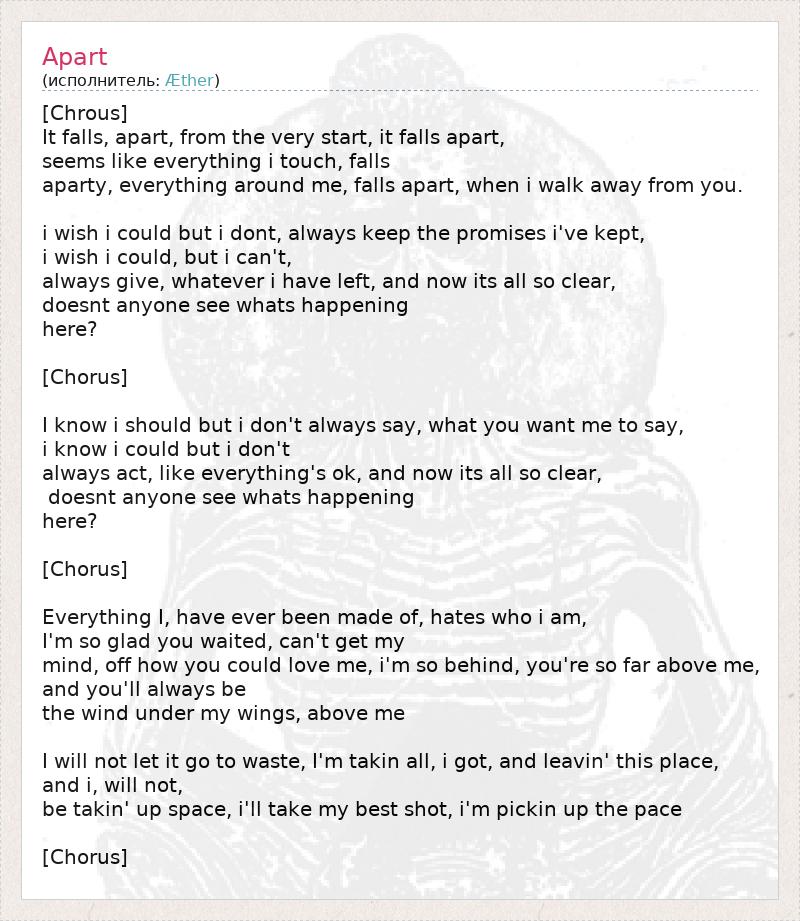[Chrous] It falls, apart, from the very start, it falls apart, seems like everything i touch, falls aparty, everything around me, falls apart, when i walk away from you. i wish i could but i dont, always keep the promises i've kept, i wish i could, but i can't, always give, whatever i have left, and now its all so clear, doesnt anyone see whats happening here? [Chorus] I know i should but i don't always say, what you want me to say, i know i could but i don't always act, like everything's ok, and now its all so clear, doesnt anyone see whats happening here? [Chorus] Everything I, have ever been made of, hates who i am, I'm so glad you waited, can't get my mind, off how you could love me, i'm so behind, you're so far above me, and you'll always be the wind under my wings, above me I will not let it go to waste, I'm takin all, i got, and leavin' this place, and i, will not, be takin' up space, i'll take my best shot, i'm pickin up the pace [Chorus]