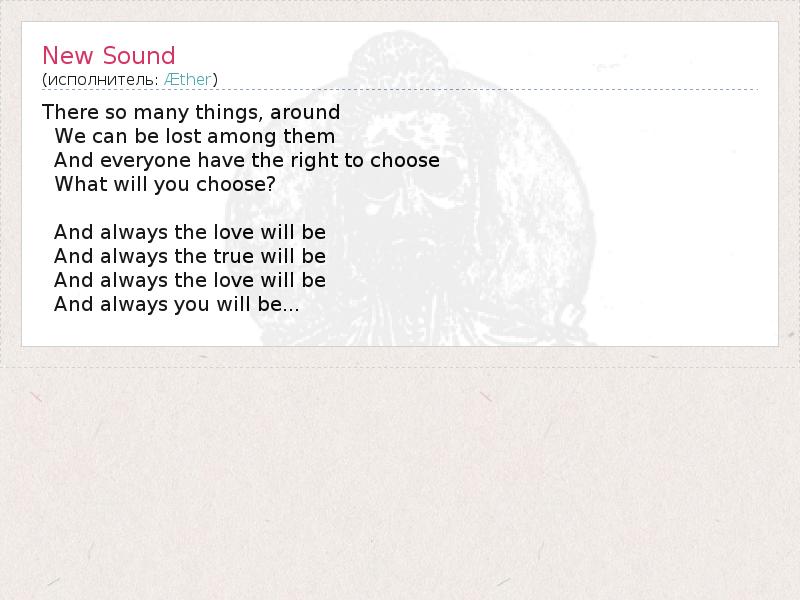 There so many things, around We can be lost among them And everyone have the right to choose What will you choose? And always the love will be And always the true will be And always the love will be And always you will be...