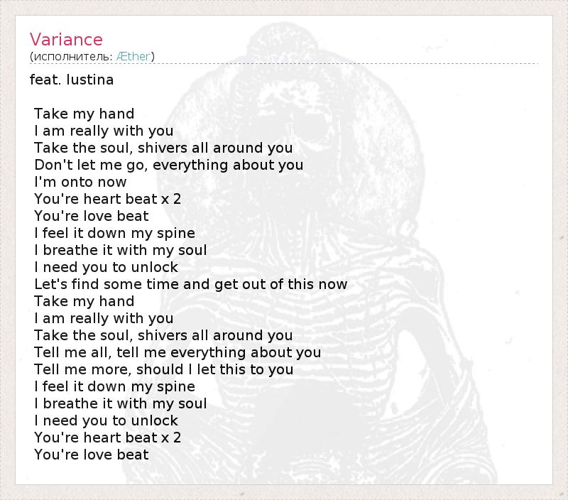 feat. Iustina Take my hand I am really with you Take the soul, shivers all around you Don't let me go, everything about you I'm onto now You're heart beat x 2 You're love beat I feel it down my spine I breathe it with my soul I need you to unlock Let's find some time and get out of this now Take my hand I am really with you Take the soul, shivers all around you Tell me all, tell me everything about you Tell me more, should I let this to you I feel it down my spine I breathe it with my soul I need you to unlock You're heart beat x 2 You're love beat