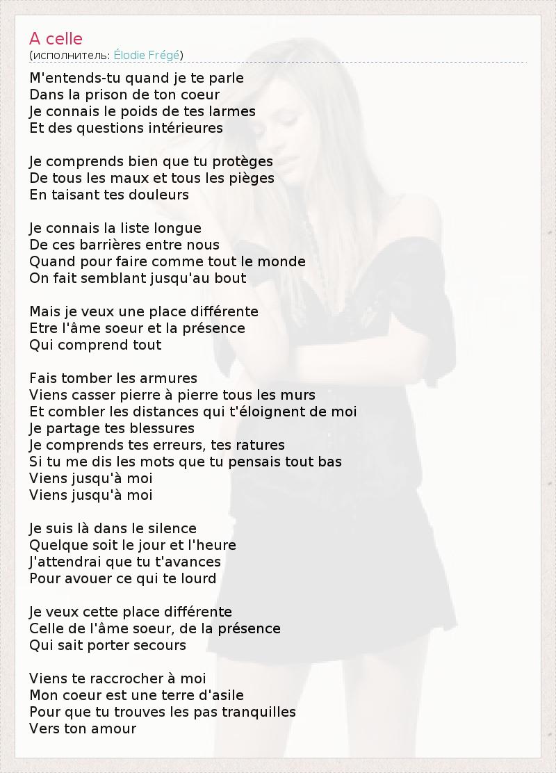 M'entends-tu quand je te parle Dans la prison de ton coeur Je connais le poids de tes larmes Et des questions intérieures Je comprends bien que tu protèges De tous les maux et tous les pièges En taisant tes douleurs Je connais la liste longue De ces barrières entre nous Quand pour faire comme tout le monde On fait semblant jusqu'au bout Mais je veux une place différente Etre l'âme soeur et la présence Qui comprend tout Fais tomber les armures Viens casser pierre à pierre tous les murs Et combler les distances qui t'éloignent de moi Je partage tes blessures Je comprends tes erreurs, tes ratures Si tu me dis les mots que tu pensais tout bas Viens jusqu'à moi Viens jusqu'à moi Je suis là dans le silence Quelque soit le jour et l'heure J'attendrai que tu t'avances Pour avouer ce qui te lourd Je veux cette place différente Celle de l'âme soeur, de la présence Qui sait porter secours Viens te raccrocher à moi Mon coeur est une terre d'asile Pour que tu trouves les pas tranquilles Vers ton amour