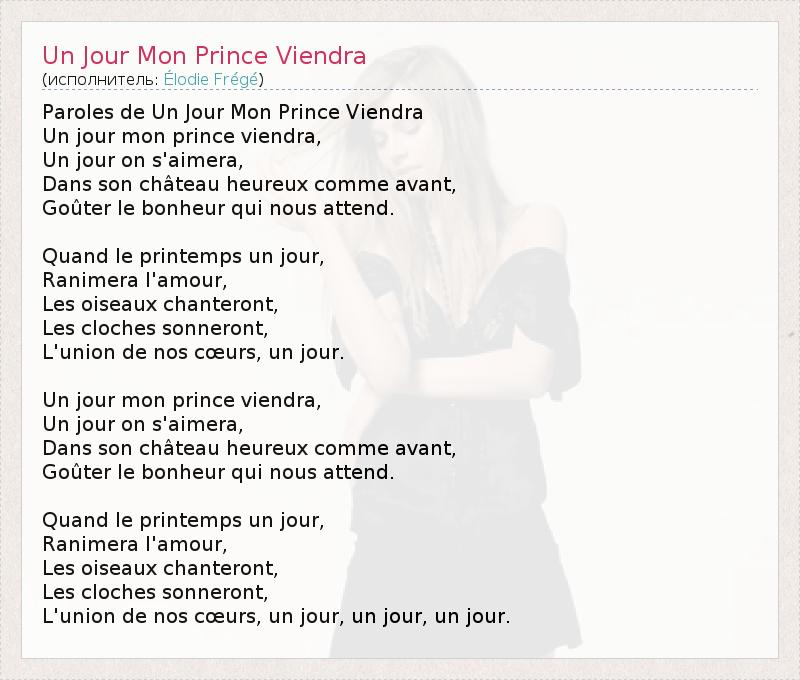 Paroles де Un Jour Mon князя Viendra Un Jour пн князь viendra , Un Jour на s'aimera , Dans сыном замок Heureux Comme Avant , Гуте ле Bonheur Квай ум посещают . Quand Le Printemps ип Jour , Ranimera L'Amour , Лес Oiseaux chanteront , Les колпаков sonneront , L'Union De NOS Coeurs ООН Jour . Un Jour пн князь viendra , Un Jour на s'aimera , Dans сыном замок Heureux Comme Avant , Гуте ле Bonheur Квай ум посещают . Quand Le Printemps ип Jour , Ranimera L'Amour , Лес Oiseaux chanteront , Les колпаков sonneront , L'Union De NOS Coeurs ООН Jour , ООН Jour , ООН Jour .