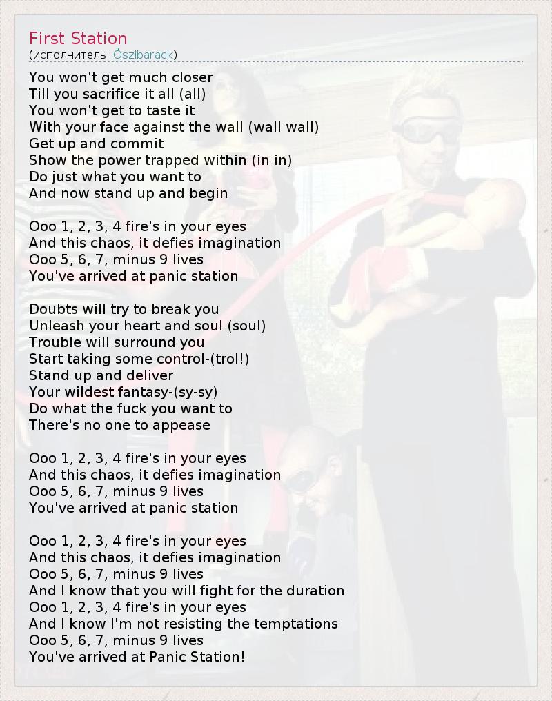 Ты не подберешься ближе, Пока не пожертвуешь всем. Ты не сможешь попробовать это, Впав в отчаяние. 1 Поднимись и действуй, Покажи силу, запертую внутри. Делай то, что хочешь, А теперь встань и вперёд! Ооо 1, 2, 3, 4 огонь в твоих глазах, И этот хаос, не поддающийся воображению. Ооо 5, 6, 7, минус 9 жизней, Ты прибыла на станцию паники. Сомнения попытаются сломать тебя, Дай волю сердцу и душе. Проблемы будут окружать тебя, Начни контролировать это. Вставай и претворяй в жизнь Свои самые смелые фантазии. Чёрт, делай всё, что хочешь, Никто не обуздает тебя! Ооо 1, 2, 3, 4 огонь в твоих глазах, И этот хаос, не поддающийся воображению. Ооо 5, 6, 7, минус 9 жизней, Ты прибыла на станцию паники. Ооо 1, 2, 3, 4 огонь в твоих глазах, И этот хаос, не поддающийся воображению. Ооо 5, 6, 7, минус 9 жизней, И я знаю, что ты будешь сражаться за продолжительность. Ооо 1, 2, 3, 4 огонь в твоих глазах, Я знаю, что не буду противиться соблазнам. Ооо 5, 6, 7, минус 9 жизней, Ты прибыла на станцию паники! 1 - устойч. выражение. Turn face to the wall - впасть в отчаяние, приготовиться к смерти, опустить руки.