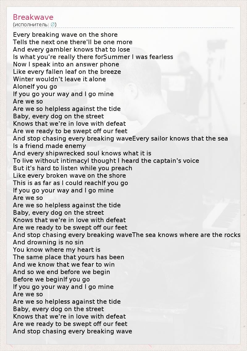 Every breaking wave on the shore Tells the next one there'll be one more And every gambler knows that to lose Is what you're really there forSummer I was fearless Now I speak into an answer phone Like every fallen leaf on the breeze Winter wouldn't leave it alone AloneIf you go If you go your way and I go mine Are we so Are we so helpless against the tide Baby, every dog on the street Knows that we're in love with defeat Are we ready to be swept off our feet And stop chasing every breaking waveEvery sailor knows that the sea Is a friend made enemy And every shipwrecked soul knows what it is To live without intimacyI thought I heard the captain's voice But it's hard to listen while you preach Like every broken wave on the shore This is as far as I could reachIf you go If you go your way and I go mine Are we so Are we so helpless against the tide Baby, every dog on the street Knows that we're in love with defeat Are we ready to be swept off our feet And stop chasing every breaking waveThe sea knows where are the rocks And drowning is no sin You know where my heart is The same place that yours has been And we know that we fear to win And so we end before we begin Before we beginIf you go If you go your way and I go mine Are we so Are we so helpless against the tide Baby, every dog on the street Knows that we're in love with defeat Are we ready to be swept off our feet And stop chasing every breaking wave