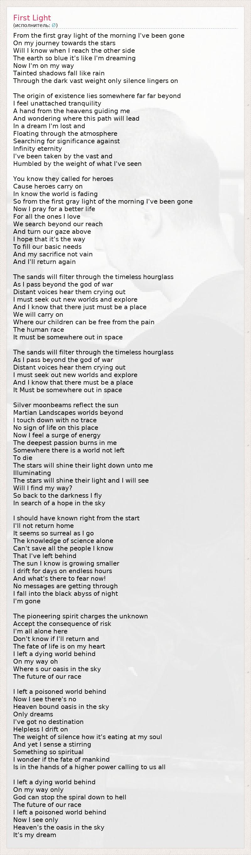 С первым бледным светом утра я отправился В своё путешествие к звёздам. Узнаю ли я, когда достигну другой стороны? Земля такая синяя – я будто во сне. Сейчас я на верном пути. Пятнистые тени падают, словно дождь. Сквозь тёмную громаду тянется лишь тишина. Начало мироздания лежит где-то очень, очень далеко. Я чувствую спокойствие свободы, Рука небес ведёт меня, И я спрашиваю – куда приведёт этот путь? В своём сне я был потерян, и Плыл сквозь атмосферу, Ища смысл, вопреки Бесконечности, вечности. Я был поражён обширностью и Унижен значимостью того, что я увидел. Знаешь, они взывали к героям, Потому что герои идут вперёд, Даже зная, что мир рушится. И с первым бледным светом утра я ушёл... Теперь я молю о лучшей жизни Для всех тех, кого я люблю. Мы ищем за пределами досягаемости, И поднимаем наш пристальный взгляд выше. Я надеюсь, что это верный путь К тому, чтобы удовлетворить наши важнейшие потребности, И что моя жертва не напрасна, И я снова вернусь. Пески пройдут сквозь бесконечные песочные часы, Как я прохожу перед богом войны. Далёкие голоса, я слышу их плач. Я должен найти новый мир и исследовать его, И я знаю, что просто обязано существовать место, Где мы продолжим нашу жизнь, Где наши дети будут свободны от боли Человечества. Оно должно быть где-то в космосе. Пески пройдут сквозь бесконечные песочные часы, Как я прохожу перед богом войны. Далёкие голоса, я слышу их плач. Я должен найти новый мир и исследовать его, И я знаю, что просто обязано существовать такое место, Оно должно быть где-то в космосе. Сверкающая дорожка лунного света отражает солнце. Мир марсианских пейзажей лежит впереди Я приземляюсь незаметно – Ни следа жизни на этой земле. Теперь я чувствую прилив сил – Сильнейший энтузиазм горит во мне: Где-то есть мир, не оставшийся Умирать. Звёзды будут дарить мне своё сияние, Освещая... Звёзды будут светить, и я увижу, Найду ли я свой путь? Я лечу обратно во тьму, Ища надежду в небе... Я с самого начала должен был знать: Я не вернусь домой – Пока я двигаюсь вперёд, это кажется всё более нереальным. Одной лишь мудрости науки Не спасти всех людей – я знаю – Которых я оставил позади. Солнце – я знаю – становится меньше. Я плыву бесконечные дни и часы, И чего мне бояться теперь! Ни одно сообщение не проходит, Я проваливаюсь в чёрную бездну ночи. Меня уже нет... Новаторский дух заполняет неизвестность, Подтверждает важность риска. Я здесь совсем один. Не знаю, вернусь ли назад, и Судьба Жизни – в моих руках. Я оставил позади умирающий мир, Отправившись в путь, о... Где наш оазис на небесах? Будущее нашей расы... Я оставил позади отравленный мир. Теперь я вижу, что нет Никакого благословенного оазиса на небе – Только мечты. Мне некуда стремиться, Я плыву, беспомощный. Тяжесть тишины, как она съедает мою душу! И всё же я чувствую пробуждение Чего-то возвышенного. Быть может, судьба человечества – В руках высшей силы, взывающей ко всем нам? Я оставил позади умирающий мир. На моём пути только Бог может остановить спираль, заводящую в ад Будущее нашей расы. Я оставил позади отравленный мир. Сейчас я вижу только Рай – оазис в небе. Это – моя мечта.