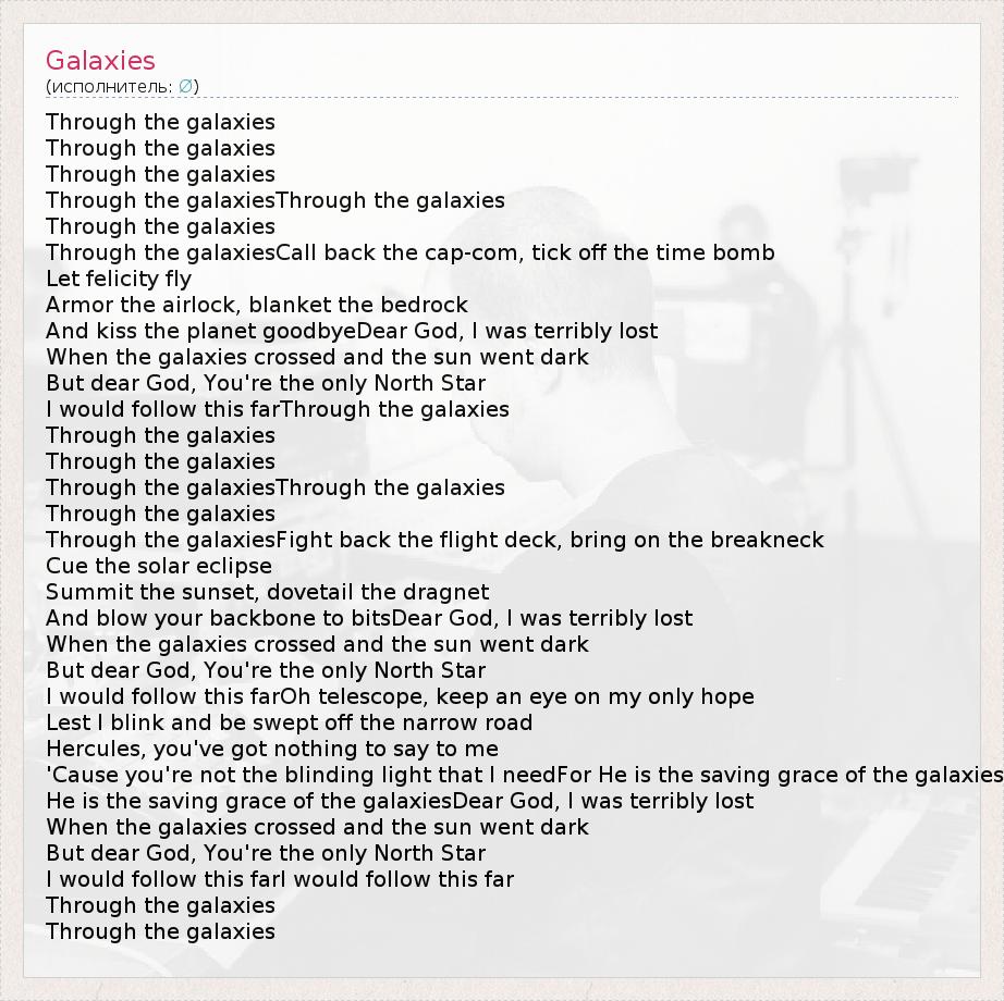 Through the galaxies Through the galaxies Through the galaxies Through the galaxiesThrough the galaxies Through the galaxies Through the galaxiesCall back the cap-com, tick off the time bomb Let felicity fly Armor the airlock, blanket the bedrock And kiss the planet goodbyeDear God, I was terribly lost When the galaxies crossed and the sun went dark But dear God, You're the only North Star I would follow this farThrough the galaxies Through the galaxies Through the galaxies Through the galaxiesThrough the galaxies Through the galaxies Through the galaxiesFight back the flight deck, bring on the breakneck Cue the solar eclipse Summit the sunset, dovetail the dragnet And blow your backbone to bitsDear God, I was terribly lost When the galaxies crossed and the sun went dark But dear God, You're the only North Star I would follow this farOh telescope, keep an eye on my only hope Lest I blink and be swept off the narrow road Hercules, you've got nothing to say to me 'Cause you're not the blinding light that I needFor He is the saving grace of the galaxies He is the saving grace of the galaxiesDear God, I was terribly lost When the galaxies crossed and the sun went dark But dear God, You're the only North Star I would follow this farI would follow this far Through the galaxies Through the galaxies