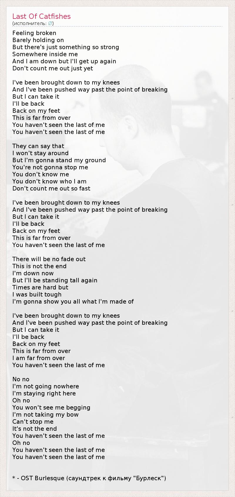 Feeling broken Barely holding on But there's just something so strong Somewhere inside me And I am down but I'll get up again Don't count me out just yet I've been brought down to my knees And I've been pushed way past the point of breaking But I can take it I'll be back Back on my feet This is far from over You haven't seen the last of me You haven't seen the last of me They can say that I won't stay around But I'm gonna stand my ground You're not gonna stop me You don't know me You don't know who I am Don't count me out so fast I've been brought down to my knees And I've been pushed way past the point of breaking But I can take it I'll be back Back on my feet This is far from over You haven't seen the last of me There will be no fade out This is not the end I'm down now But I'll be standing tall again Times are hard but I was built tough I'm gonna show you all what I'm made of I've been brought down to my knees And I've been pushed way past the point of breaking But I can take it I'll be back Back on my feet This is far from over I am far from over You haven't seen the last of me No no I'm not going nowhere I'm staying right here Oh no You won't see me begging I'm not taking my bow Can't stop me It's not the end You haven't seen the last of me Oh no You haven't seen the last of me You haven't seen the last of me * - OST Burlesque (саундтрек к фильму "Бурлеск")