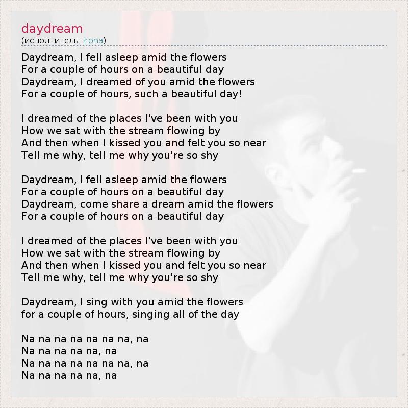 Daydream, I fell asleep amid the flowers For a couple of hours on a beautiful day Daydream, I dreamed of you amid the flowers For a couple of hours, such a beautiful day! I dreamed of the places I've been with you How we sat with the stream flowing by And then when I kissed you and felt you so near Tell me why, tell me why you're so shy Daydream, I fell asleep amid the flowers For a couple of hours on a beautiful day Daydream, come share a dream amid the flowers For a couple of hours on a beautiful day I dreamed of the places I've been with you How we sat with the stream flowing by And then when I kissed you and felt you so near Tell me why, tell me why you're so shy Daydream, I sing with you amid the flowers for a couple of hours, singing all of the day Na na na na na na na, na Na na na na na, na Na na na na na na na, na Na na na na na, na