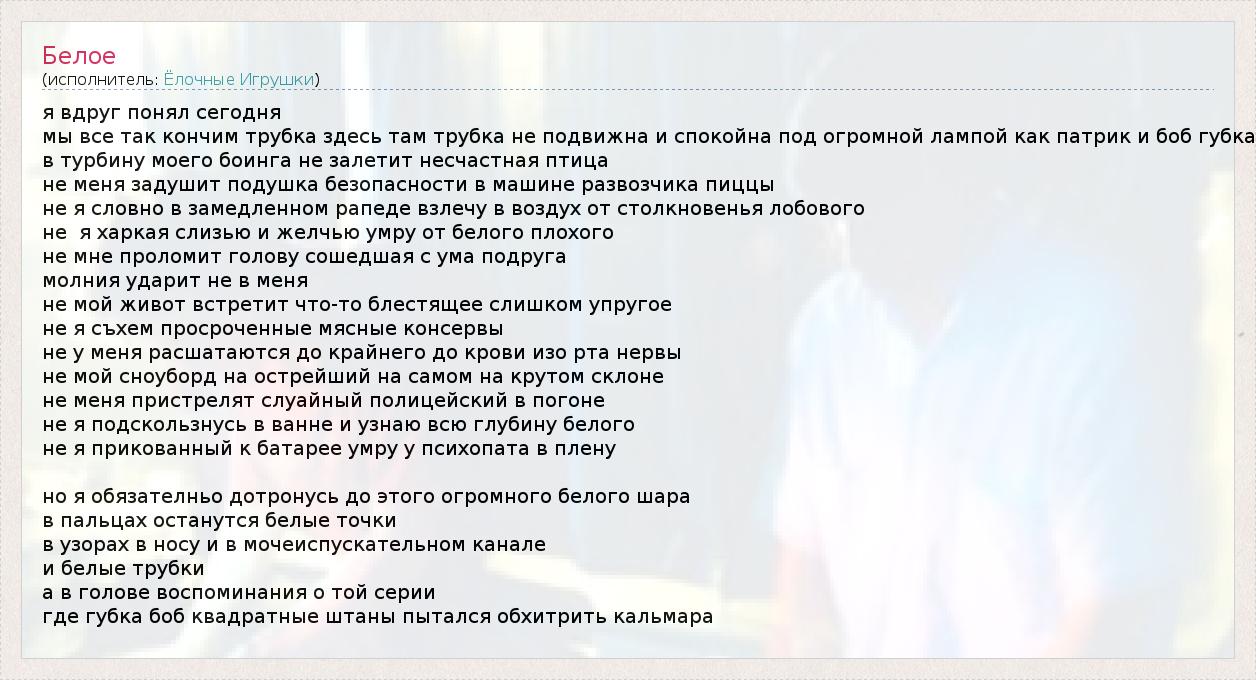 я вдруг понял сегодня мы все так кончим трубка здесь там трубка не подвижна и спокойна под огромной лампой как патрик и боб губка в турбину моего боинга не залетит несчастная птица не меня задушит подушка безопасности в машине развозчика пиццы не я словно в замедленном рапеде взлечу в воздух от столкновенья лобового не я харкая слизью и желчью умру от белого плохого не мне проломит голову сошедшая с ума подруга молния ударит не в меня не мой живот встретит что-то блестящее слишком упругое не я съхем просроченные мясные консервы не у меня расшатаются до крайнего до крови изо рта нервы не мой сноуборд на острейший на самом на крутом склоне не меня пристрелят слуайный полицейский в погоне не я подскользнусь в ванне и узнаю всю глубину белого не я прикованный к батарее умру у психопата в плену но я обязателньо дотронусь до этого огромного белого шара в пальцах останутся белые точки в узорах в носу и в мочеиспускательном канале и белые трубки а в голове воспоминания о той серии где губка боб квадратные штаны пытался обхитрить кальмара