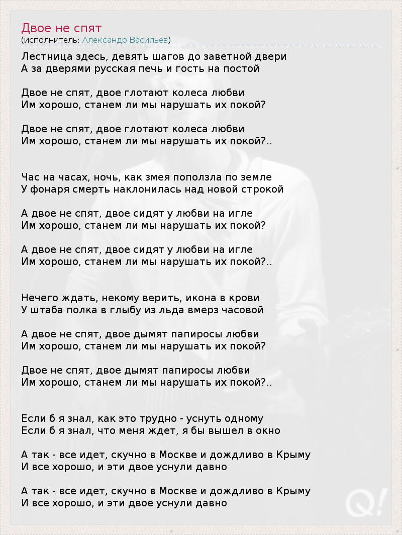 Лестница здесь, девять шагов до заветной двери А за дверями русская печь и гость на постой Двое не спят, двое глотают колеса любви Им хорошо, станем ли мы нарушать их покой? Двое не спят, двое глотают колеса любви Им хорошо, станем ли мы нарушать их покой?.. Час на часах, ночь, как змея поползла по земле У фонаря смерть наклонилась над новой строкой А двое не спят, двое сидят у любви на игле Им хорошо, станем ли мы нарушать их покой? А двое не спят, двое сидят у любви на игле Им хорошо, станем ли мы нарушать их покой?.. Нечего ждать, некому верить, икона в крови У штаба полка в глыбу из льда вмерз часовой А двое не спят, двое дымят папиросы любви Им хорошо, станем ли мы нарушать их покой? Двое не спят, двое дымят папиросы любви Им хорошо, станем ли мы нарушать их покой?.. Если б я знал, как это трудно - уснуть одному Если б я знал, что меня ждет, я бы вышел в окно А так - все идет, скучно в Москве и дождливо в Крыму И все хорошо, и эти двое уснули давно А так - все идет, скучно в Москве и дождливо в Крыму И все хорошо, и эти двое уснули давно