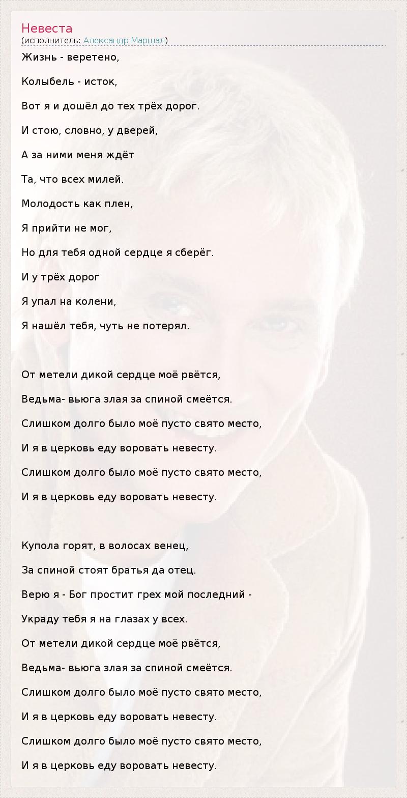 Это интересно:Александр Маршал - по паспорту Александр Витальевич Миньков - родился 7 июня 1957 г. в городе Кореновске Краснодарского края. В начале 80-х годов переехал в Москву, где вскоре начал сотрудничать с продюсером Стасом Наминым. В 1987-м году переходит в российскую рок-группу "Парк Горького", меняя на позиции вокалиста Николая Носкова, и переезжает вместе с ней в США. В конце 1998-го покидает... продолжение