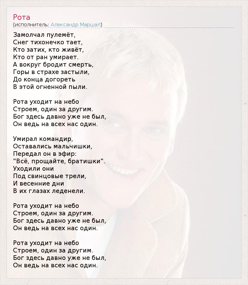 Замолчал пулемёт, Снег тихонечко тает, Кто затих, кто живёт, Кто от ран умирает. А вокруг бродит смерть, Горы в страхе застыли, До конца догореть В этой огненной пыли. Рота уходит на небо Строем, один за другим. Бог здесь давно уже не был, Он ведь на всех нас один. Умирал командир, Оставались мальчишки, Передал он в эфир: "Всё, прощайте, братишки". Уходили они Под свинцовые трели, И весенние дни В их глазах леденели. Рота уходит на небо Строем, один за другим. Бог здесь давно уже не был, Он ведь на всех нас один. Рота уходит на небо Строем, один за другим. Бог здесь давно уже не был, Он ведь на всех нас один.