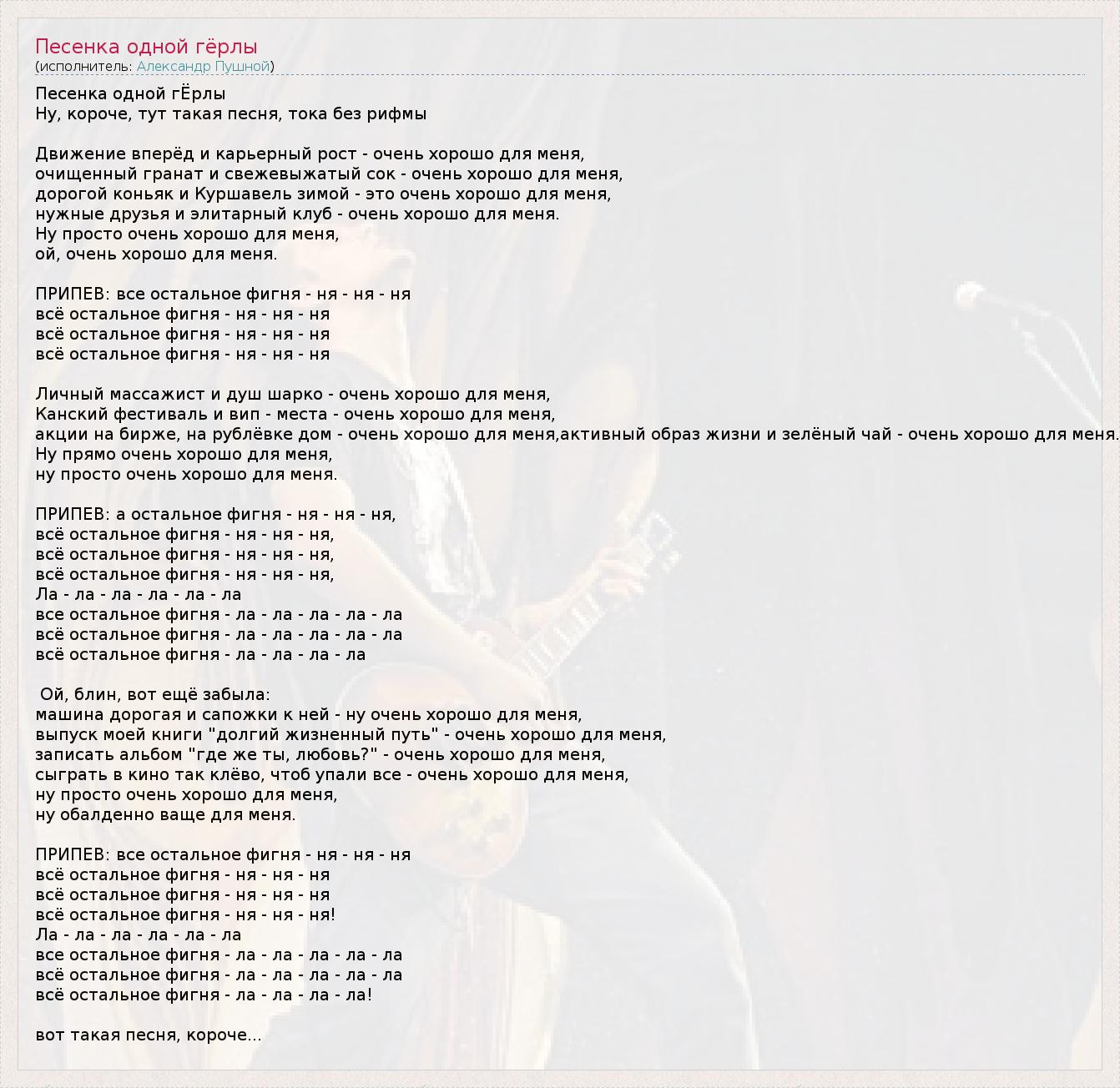 Песенка одной гЁрлы Ну, короче, тут такая песня, тока без рифмы Движение вперёд и карьерный рост - очень хорошо для меня, очищенный гранат и свежевыжатый сок - очень хорошо для меня, дорогой коньяк и Куршавель зимой - это очень хорошо для меня, нужные друзья и элитарный клуб - очень хорошо для меня. Ну просто очень хорошо для меня, ой, очень хорошо для меня. ПРИПЕВ: все остальное фигня - ня - ня - ня всё остальное фигня - ня - ня - ня всё остальное фигня - ня - ня - ня всё остальное фигня - ня - ня - ня Личный массажист и душ шарко - очень хорошо для меня, Канский фестиваль и вип - места - очень хорошо для меня, акции на бирже, на рублёвке дом - очень хорошо для меня,активный образ жизни и зелёный чай - очень хорошо для меня. Ну прямо очень хорошо для меня, ну просто очень хорошо для меня. ПРИПЕВ: а остальное фигня - ня - ня - ня, всё остальное фигня - ня - ня - ня, всё остальное фигня - ня - ня - ня, всё остальное фигня - ня - ня - ня, Ла - ла - ла - ла - ла - ла все остальное фигня - ла - ла - ла - ла - ла всё остальное фигня - ла - ла - ла - ла - ла всё остальное фигня - ла - ла - ла - ла Ой, блин, вот ещё забыла: машина дорогая и сапожки к ней - ну очень хорошо для меня, выпуск моей книги "долгий жизненный путь" - очень хорошо для меня, записать альбом "где же ты, любовь?" - очень хорошо для меня, сыграть в кино так клёво, чтоб упали все - очень хорошо для меня, ну просто очень хорошо для меня, ну обалденно ваще для меня. ПРИПЕВ: все остальное фигня - ня - ня - ня всё остальное фигня - ня - ня - ня всё остальное фигня - ня - ня - ня всё остальное фигня - ня - ня - ня! Ла - ла - ла - ла - ла - ла все остальное фигня - ла - ла - ла - ла - ла всё остальное фигня - ла - ла - ла - ла - ла всё остальное фигня - ла - ла - ла - ла! вот такая песня, короче...