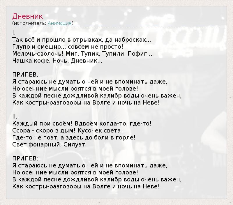 I. Так всё и прошло в отрывках, да набросках... Глупо и смешно... совсем не просто! Мелочь-сволочь! Миг. Тупик. Тупили. Пофиг... Чашка кофе. Ночь. Дневник... ПРИПЕВ: Я стараюсь не думать о ней и не впоминать даже, Но осенние мысли роятся в моей голове! В каждой песне дождливой калибр воды очень важен, Как костры-разговоры на Волге и ночь на Неве! II. Каждый при своём! Вдвоём когда-то, где-то! Ссора - скоро в дым! Кусочек света! Где-то не поэт, а здесь до боли в горле! Свет фонарный. Силуэт. ПРИПЕВ: Я стараюсь не думать о ней и не впоминать даже, Но осенние мысли роятся в моей голове! В каждой песне дождливой калибр воды очень важен, Как костры-разговоры на Волге и ночь на Неве!